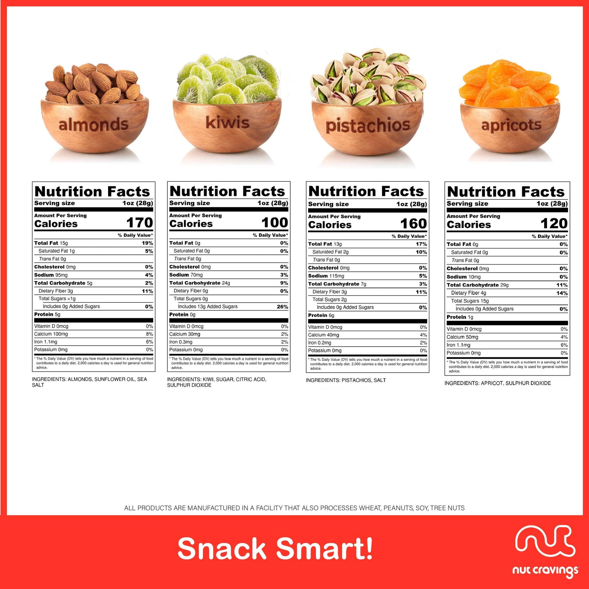 Q: What types of nuts and dried fruits are included in the NUT CRAVINGS Gourmet Collection?A: The NUT CRAVINGS Gourmet Collection includes a selection of four signature items: Dried Apricots, Dried Kiwis, Salted Roasted Pistachios, and Salted Roasted Almonds, all naturally grown and handpicked.