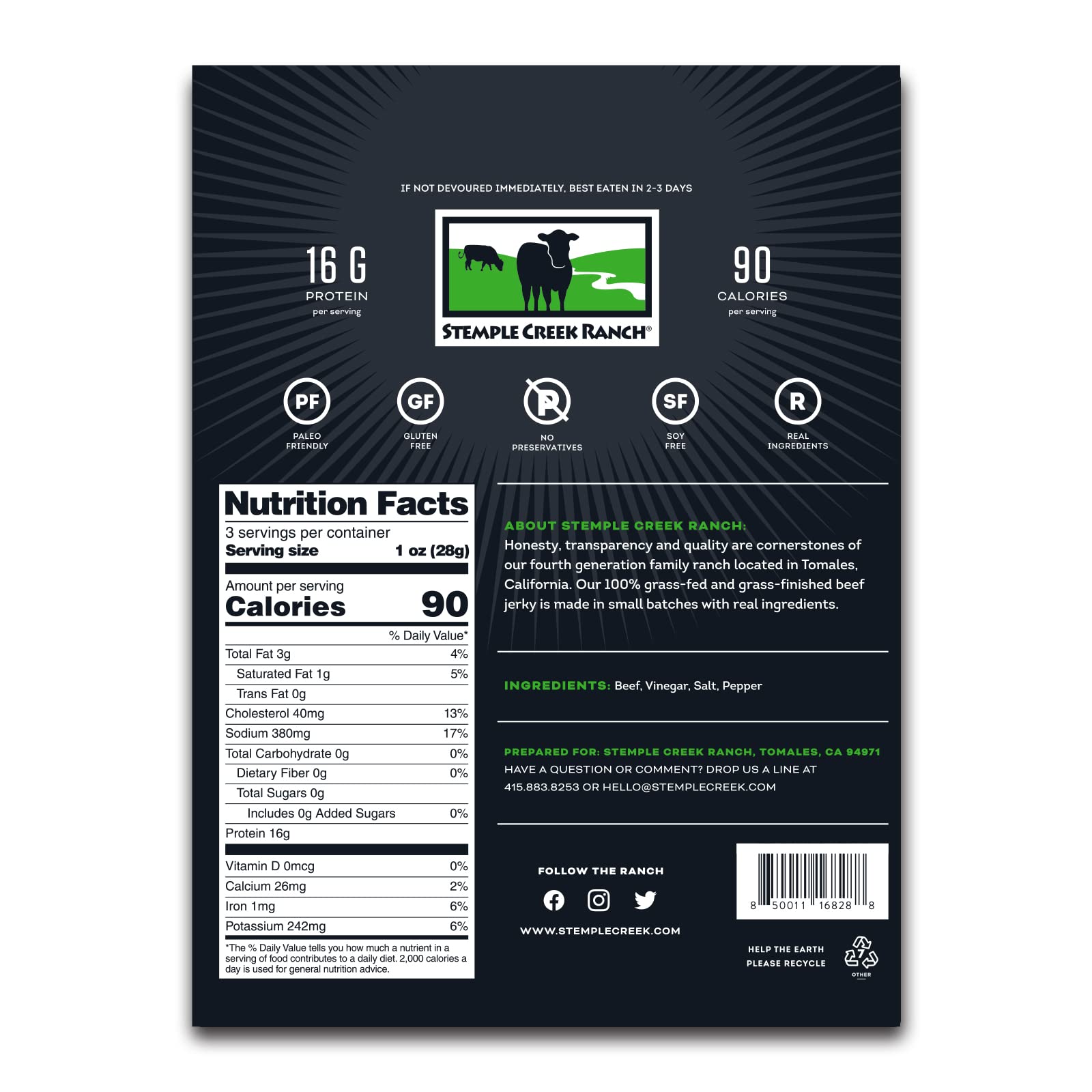 Made In Small Batches From Our 100% Grass-Fed And Finished Beef, This Lightly Seasoned, Artisanal Dry-Style Jerky Is Made With Just Four Simple Ingredients (See Below), And No Preservatives Or Artificial Flavorings. Packed With 16 Grams Of Protein Per Ounce, Gluten And Sugar-Free, This Healthy High Protein Snack Is Paleo & Keto-Friendly Too. Ingredients: Beef, Salt, Pepper, Vinegar. From Our 4Th Generation Ranch: Honesty, Transparency, And Quality Are The Cornerstones Of Our Fourth-Generation Family Ranch Located In Tomales, California.