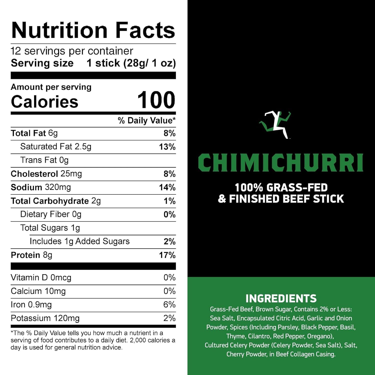 Q: What are the main ingredients in the Beef Sticks, Chimichurri?A: The Beef Sticks, Chimichurri are made with 100% grass fed and finished beef, ensuring a high-quality protein source. They also contain 1g of sugar per stick, making them a low-sugar snack option.