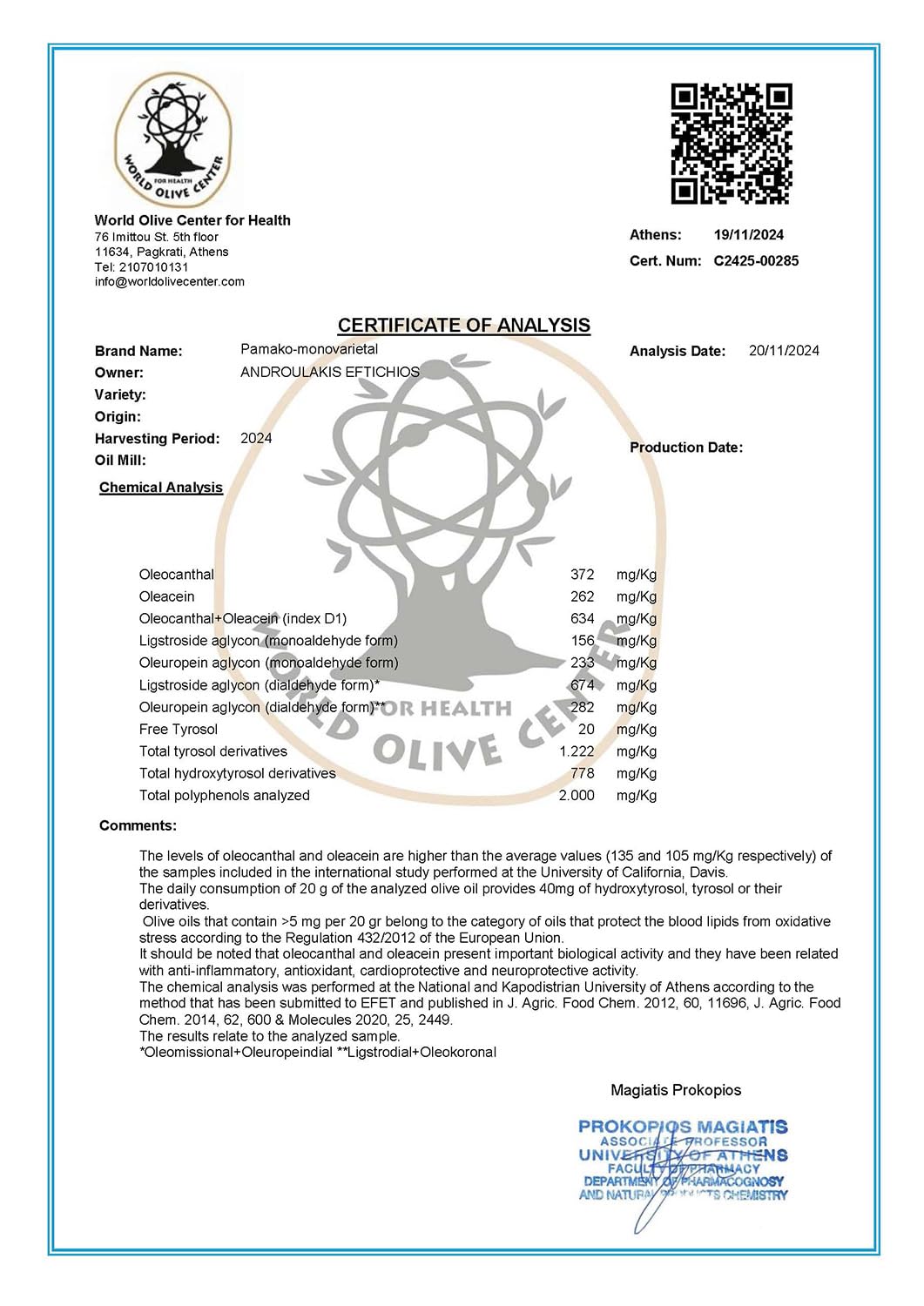 - Q: What health benefits are associated with high phenolic olive oils like Pamako? A: High phenolic olive oils, such as Pamako, are believed to offer numerous health benefits, including antioxidant, anti-inflammatory, and cardioprotective properties. Regular consumption may help protect blood lipids from oxidative stress and support overall heart health.