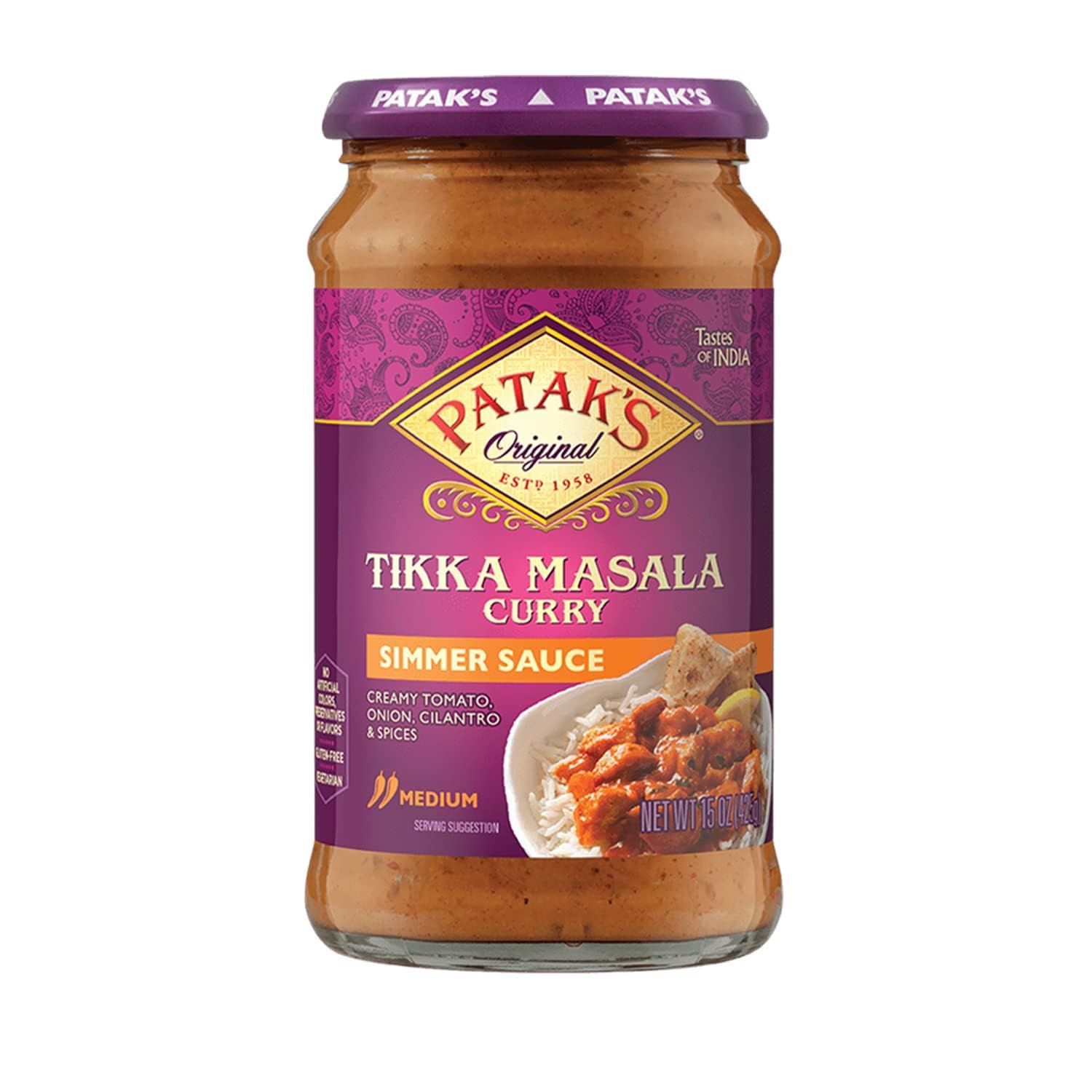 Patak's Tikka Masala Simmer Sauce - 15 Oz (Pack of 3) – With Creamy Tomato, Onion, Cilantro, and Spices, No Artificial Flavors, Gluten Free, Vegetarian Friendly. A medium tomato, yogurt and cream-based sauce with an aromatic blend of mixed spices inspired by delicious northern Indian cuisine Since 1958, our goal has been to provide you with truly authentic Indian flavors that are both easy to make and deliciously enjoyed. Using recipes passed down for three generations, Patak’s lets you enjoy traditional Indian dishes right at your dinner table, any day of the week This sauce has a complex spice blend to bring your authentic curry dish together in just a few minutes. Simply add 1 jar Patak's Tikka Masala Simmer Sauce to 1 lb seared chicken or protein of choice and simmer for 20 minutes. Enjoy with basmati rice or naan. For a veggie option, try with paneer and a handful of fresh veggies. Serves up to 6 No Artificial Flavors, Gluten Free, Vegetarian Friendly