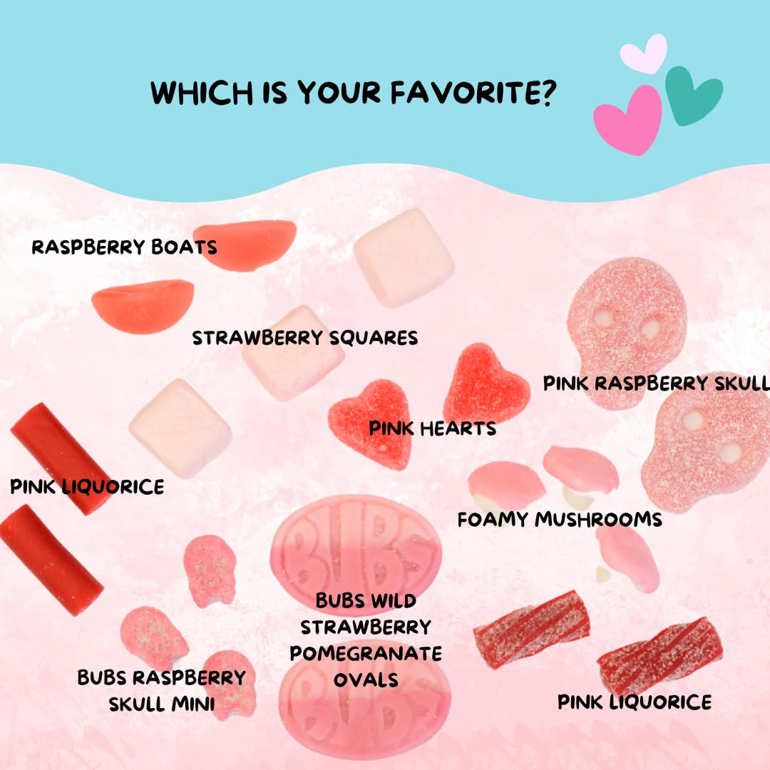 Q: Are there any unique shapes or textures in the Pink Candy?A: Absolutely! The Pink Candy includes a playful mix of shapes and textures, such as jelly, foam, soft, and sour candies, including BUBS Swedish Candy Skulls and Ovals.