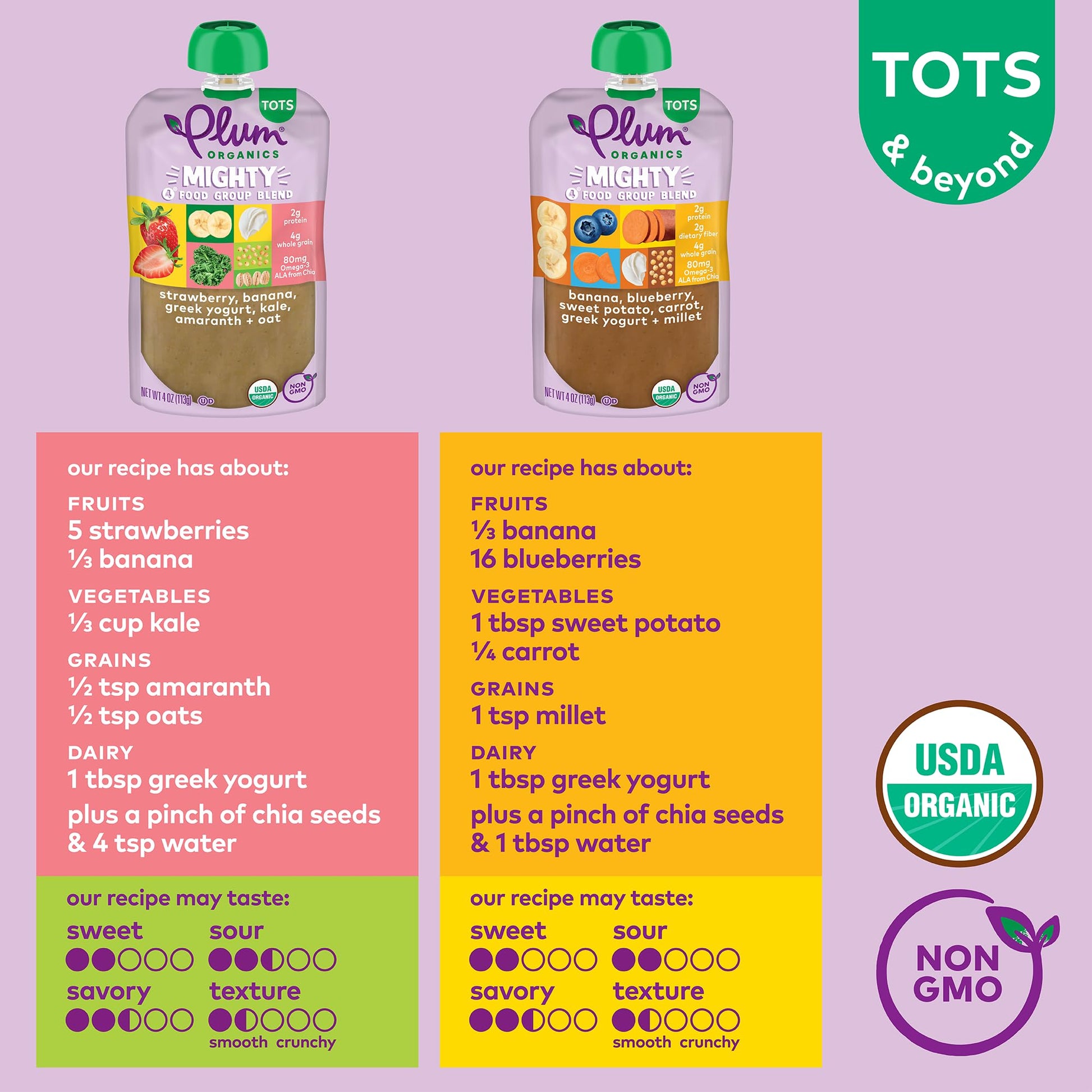 Mighty Blends For A Mighty Toddler. Plum Organics Mighty 4 Blends Are Filled With Essential Nutrients From 4 Food Group Favorites - Organic Fruits, Veggies, Dairy, And Grains - For The Perfect Snack To Fuel Your Active Toddler. Our Strawberry, Banana, Greek Yogurt, Kale, Amaranth, And Oat And Banana, Blueberry, Sweet Potato, Carrot, Greek Yogurt, And Millet Blends Are Made With Only Non-Gmo, Organic Ingredients For An Organic Toddler Food That Your Toddler Will Love. Our Plum Organics Pouches Are Naturally Preserved, Unsalted, Unsweetened, And Kosher Dairy. And Since Our Baby Food Pouches Are Convenient, Portable, And Resealable, You Can Customize Portion Sizes, Whether You'Re At Home Or You Need A Simple Snack On The Go.