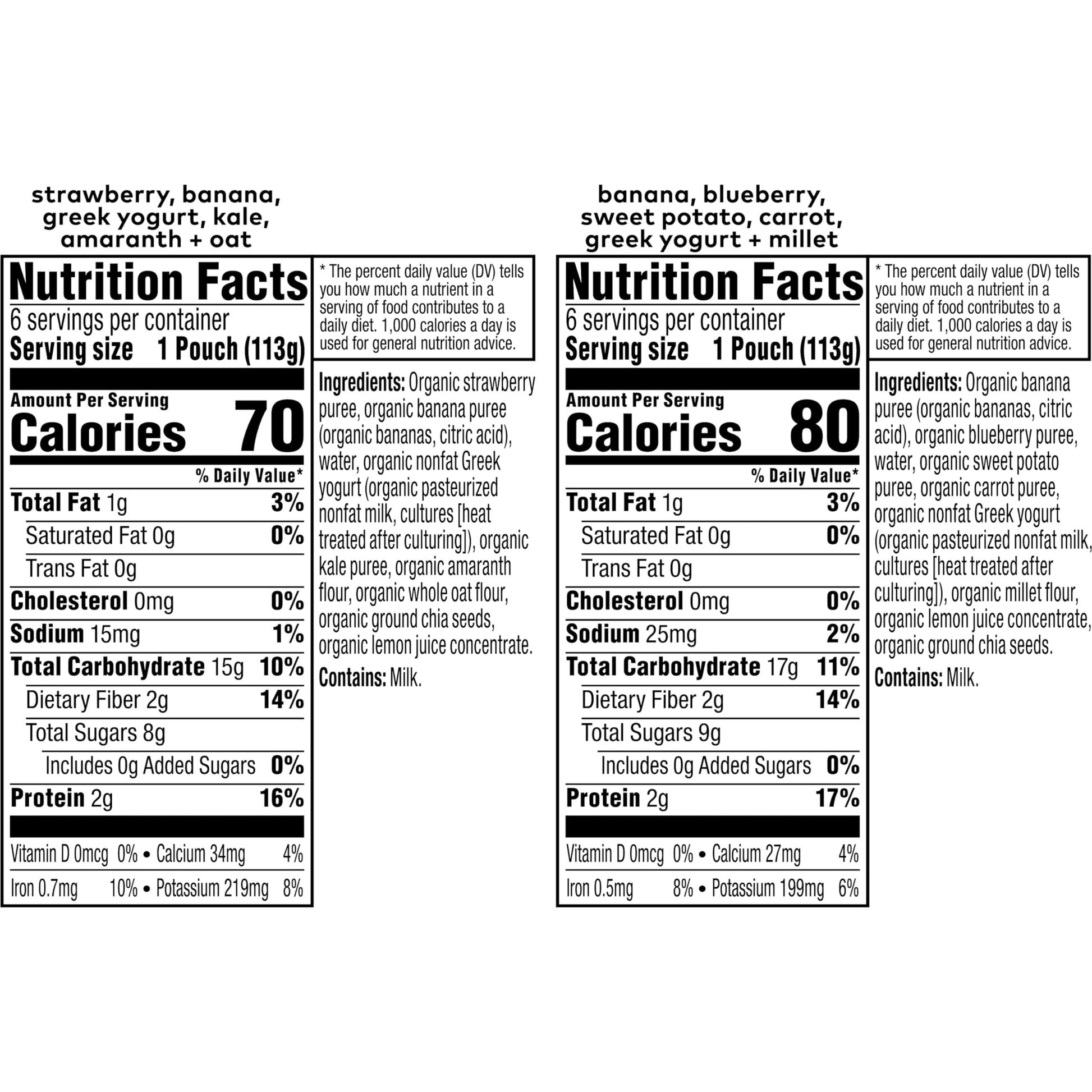 Q: What flavors are included in the variety pack?A: The variety pack includes delicious flavors such as Strawberry, Banana, Greek Yogurt, Kale, Amaranth, Oat, Banana, Blueberry, Sweet Potato, Carrot, and Millet blends.