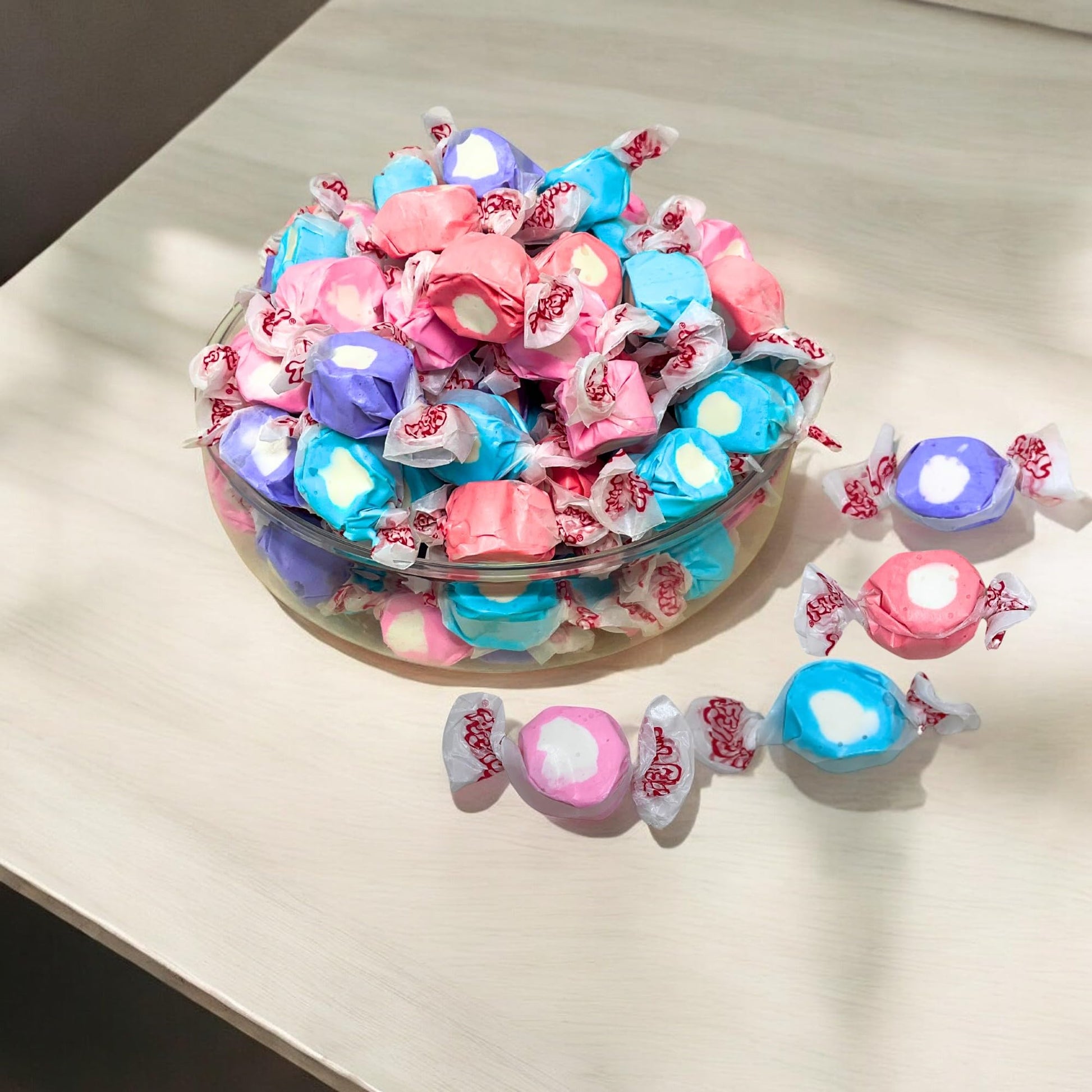 Q: How many pieces are in the 2 lb bulk bag of taffy?A: The bulk bag contains approximately 120 individually wrapped pieces, perfect for sharing or for use in candy buffets and goody bags.