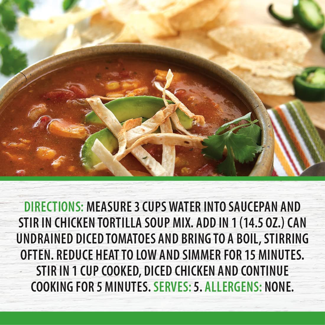 - Q: Is there any allergens in RADA's Chicken Tortilla Soup Mix? A: RADA's Chicken Tortilla Soup Mix is free from allergens, ensuring it can be enjoyed by most individuals without concern for common food sensitivities.