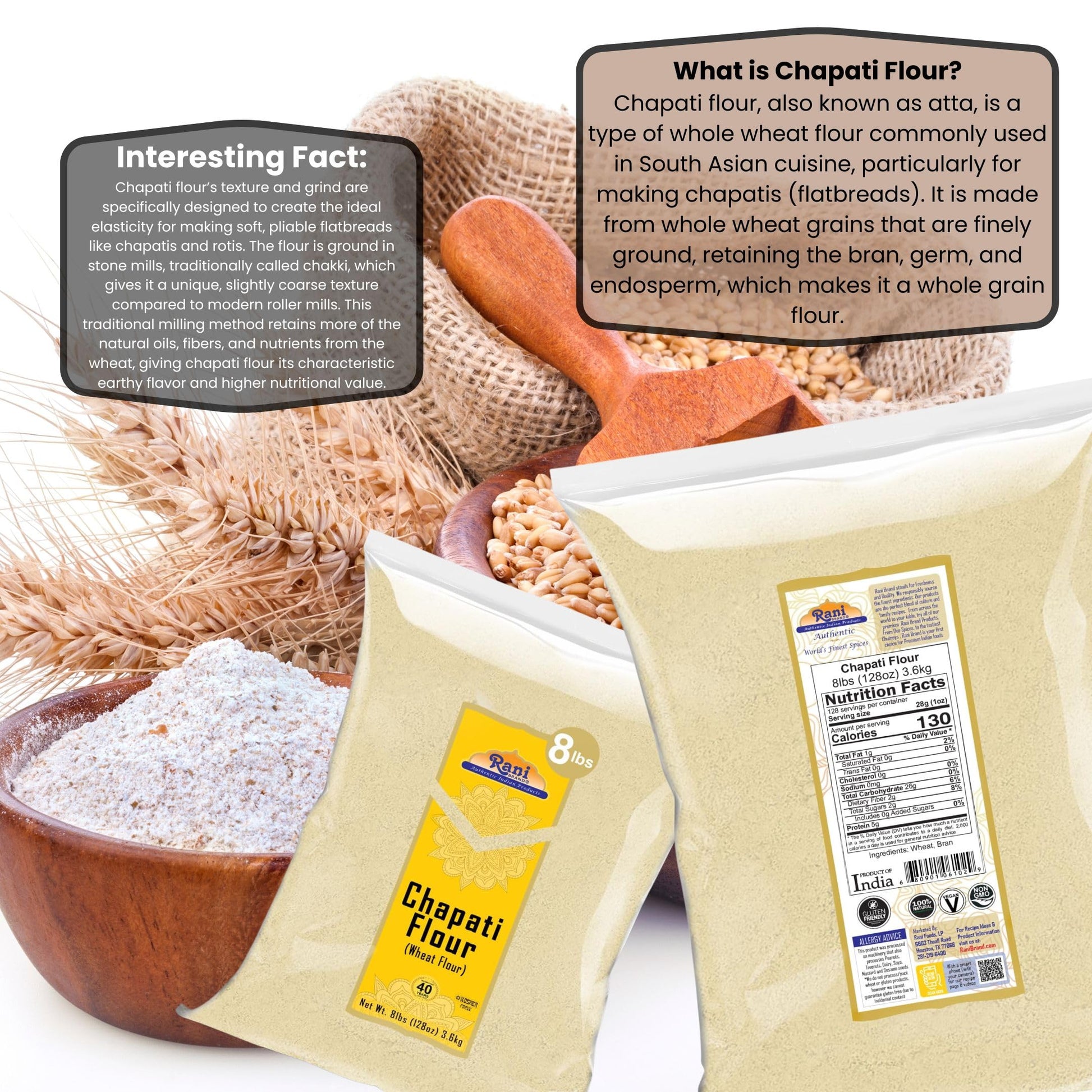 Q: What is Rani Chapati Flour made from?A: Rani Chapati Flour is made from 100% pure whole wheat, specifically durum wheat, ensuring an authentic taste and texture for making various Indian breads such as roti, chapati, and paratha.