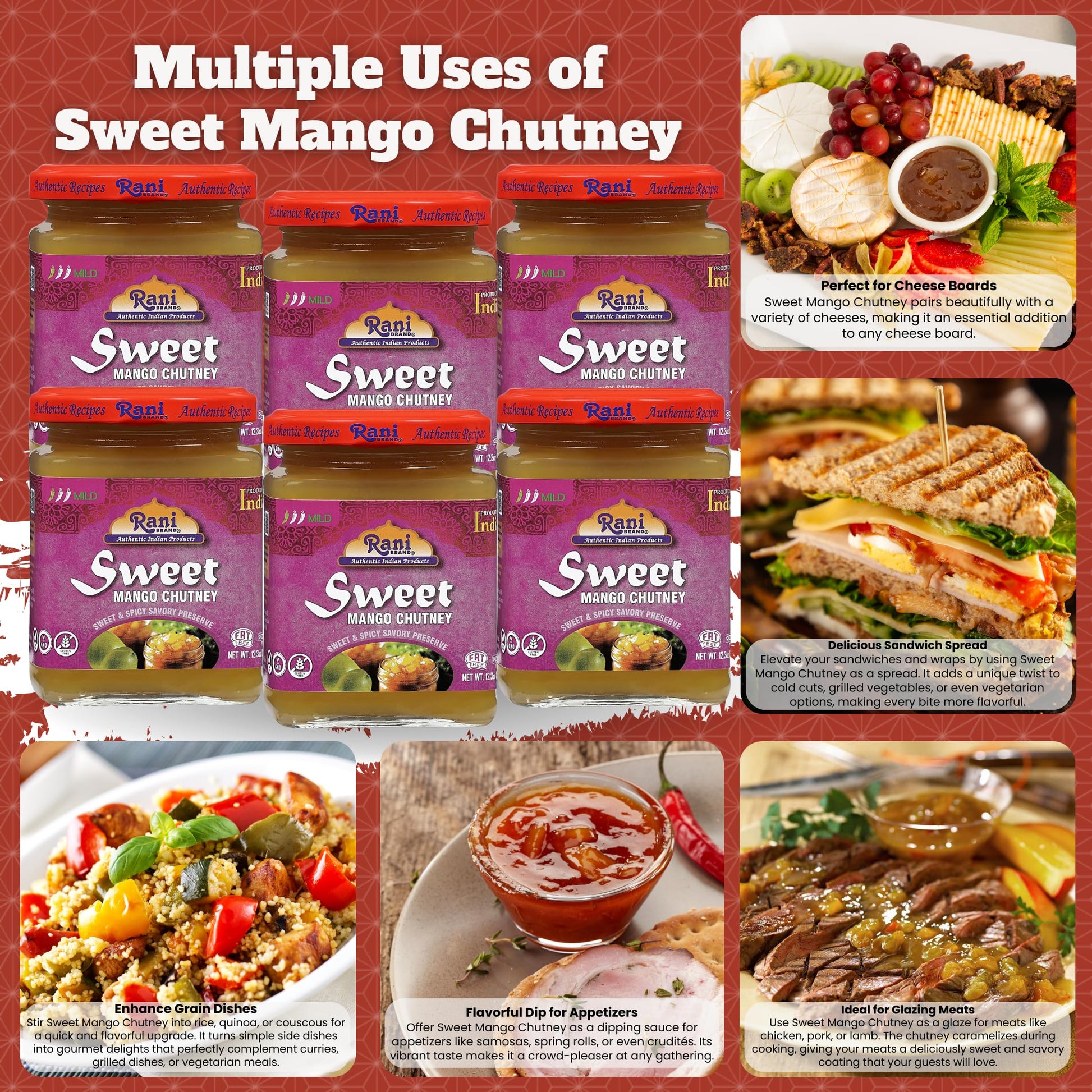 Q: How should I use Rani Sweet Mango Chutney?A: Rani Sweet Mango Chutney is versatile and can be enjoyed with a variety of dishes such as pizza, salads, burgers, sandwiches, and cheeses. It's a great way to add a sweet and spicy flavor to your meals!