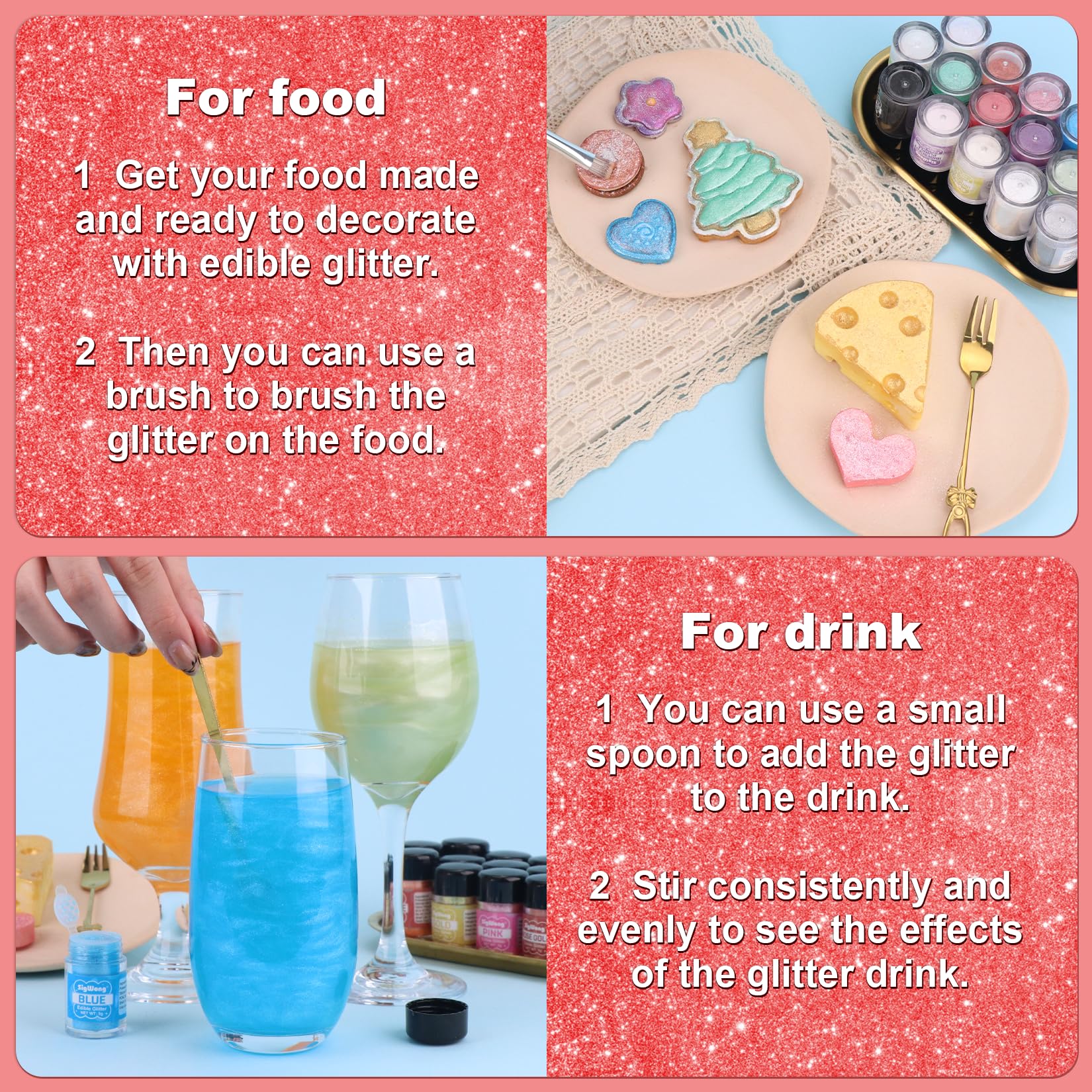 Q: How do I use the edible glitter for decorating cakes and drinks?A: Using the edible glitter is simple! You can sprinkle it directly onto your cakes, cupcakes, or drinks to add a shimmering finish. The unique cap design allows for precise control over the amount used, ensuring a beautiful decoration.