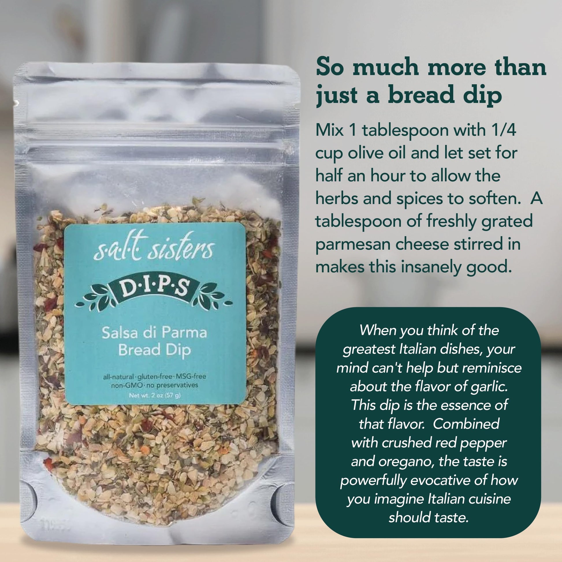 - Q: How do I prepare Salsa di Parma Bread Dip? A: To prepare, simply mix one tablespoon of the dried herbs with a good quality extra-virgin olive oil. Allow it to sit for fifteen minutes to let the flavors develop before serving.