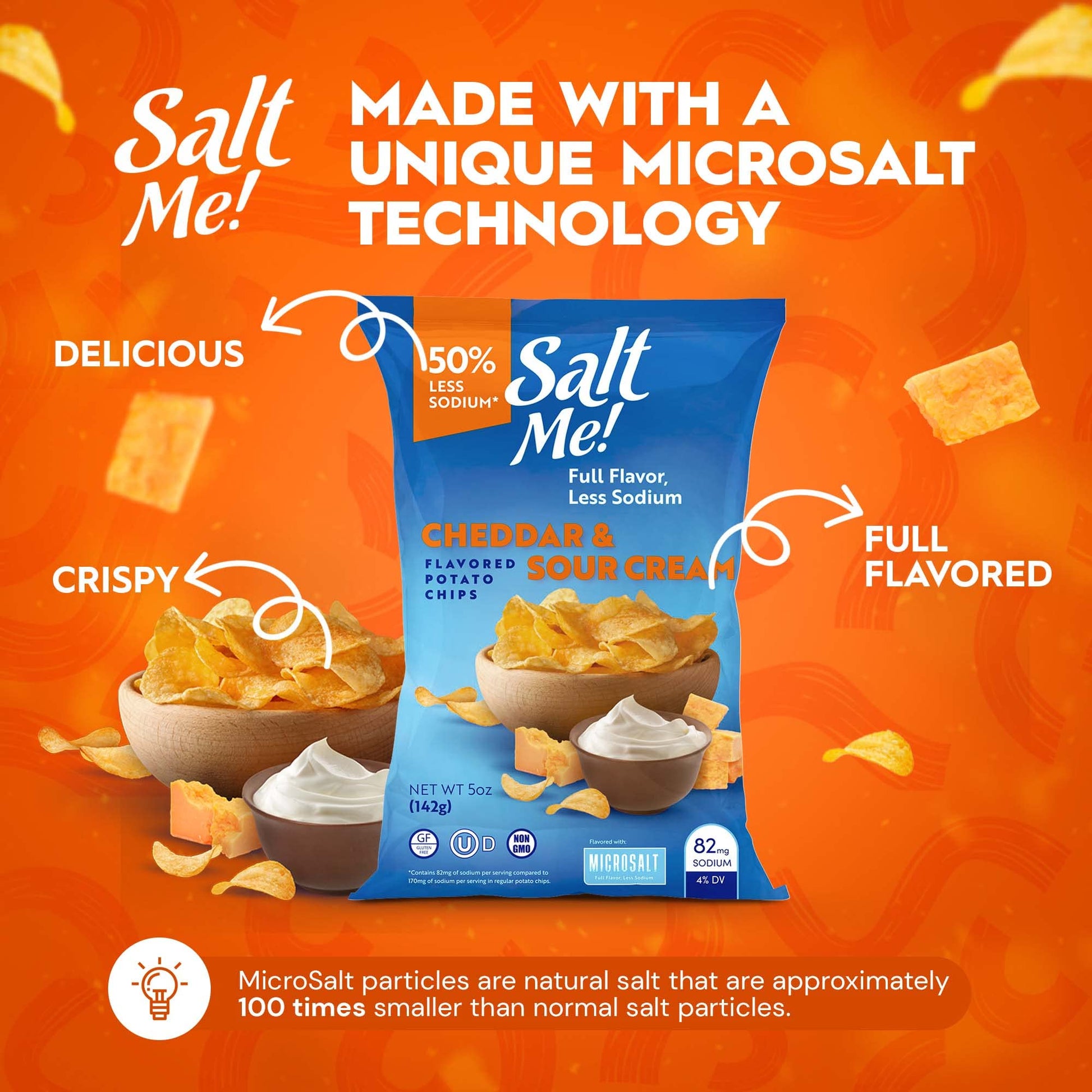 Q: What makes SaltMe! potato chips different from regular chips?A: SaltMe! potato chips use a patented technology called Microsalt, which features salt particles that are 100 times smaller than regular salt. This allows for a full flavor experience with significantly less sodium, making them a healthier snacking option.