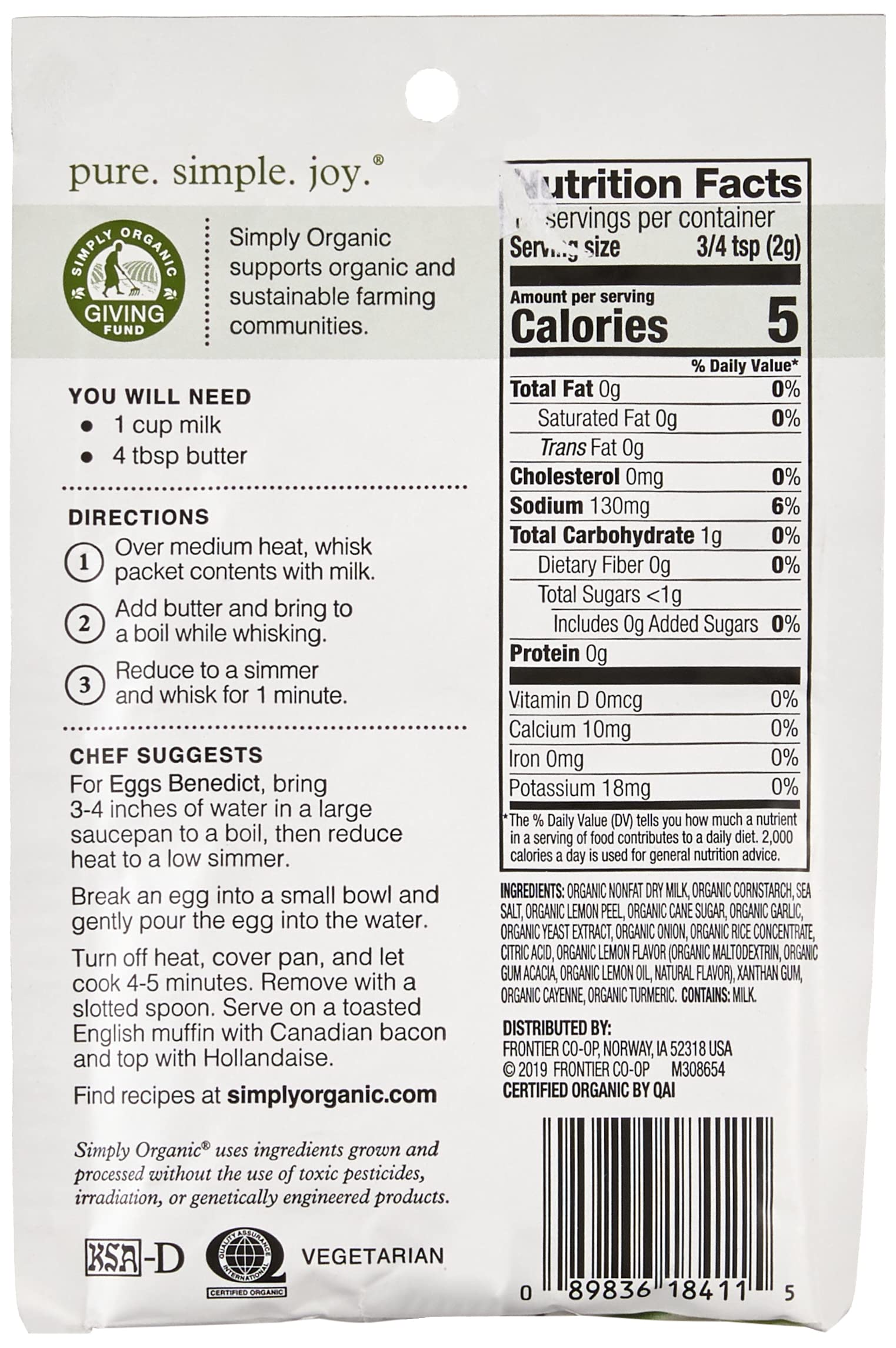 - Q: What is the shelf life of Simply Organic Hollandaise Sauce Mix? A: The shelf life of Simply Organic Hollandaise Sauce Mix is typically around 24 months when stored in a cool, dry place. Always check the expiration date on the packaging for specific guidance.