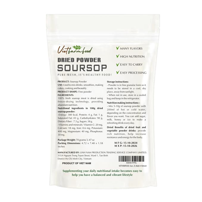 Q: What is SOURSOP POWDER and how is it made?A: SOURSOP POWDER is a freeze-dried extract made from 100% pure soursop fruit. It is produced using advanced drying technology that preserves the nutrients and natural flavors without frying the fruit in oil.