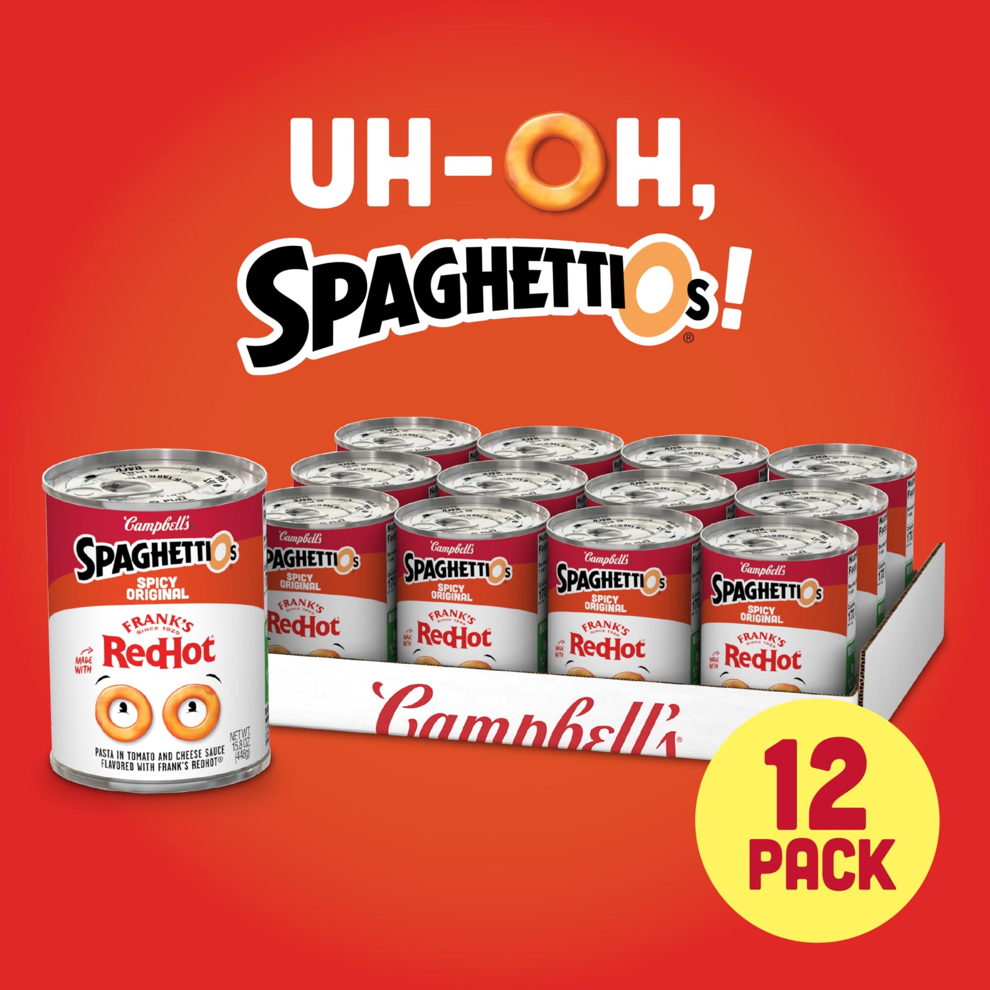 Dig Into A Dish Of Spaghettios Spicy Original Canned Pasta Made With Frank'S Redhot. Each Delicious Bite Of This Canned Pasta Features The Classic O-Shaped Pasta You Know And Love. This Canned Pasta Puts A Spicy Spin On Traditional Tomato Sauce With A Tomato And Cheese Combo That Makes A Great Addition To Any Meal. One Cup Of Spaghettios Canned Pasta Contains 1/2 Cup Of Vegetables, As Well As 4 Essential Nutrients In The Pasta As Part Of A Lunch. Break Out This Convenient Canned Food When You'Re Craving Lunch, Or Prepare It As An Entree. This Microwave Pasta Is Ready In As Little As 3 Minutes. Just Heat In A Microwave-Safe Bowl On High For 1 1/2 To 2 Minutes, Let Stand For 1 Minute, Then Stir. Or, Cook Up This Fun-Loving Pasta On The Stove. The Can Is Recyclable For Easy Disposal. Add Character To Every Bite With Spaghettios: The Neat Round Pasta You Can Eat With A Spoon. In Addition To Spicy Original Canned Pasta, Spaghettios Offers A Variety Of Unique Pasta In Fun Shapes And Sizes, Including A To Z Shapes, Disney Princesses, Star Wars And More!