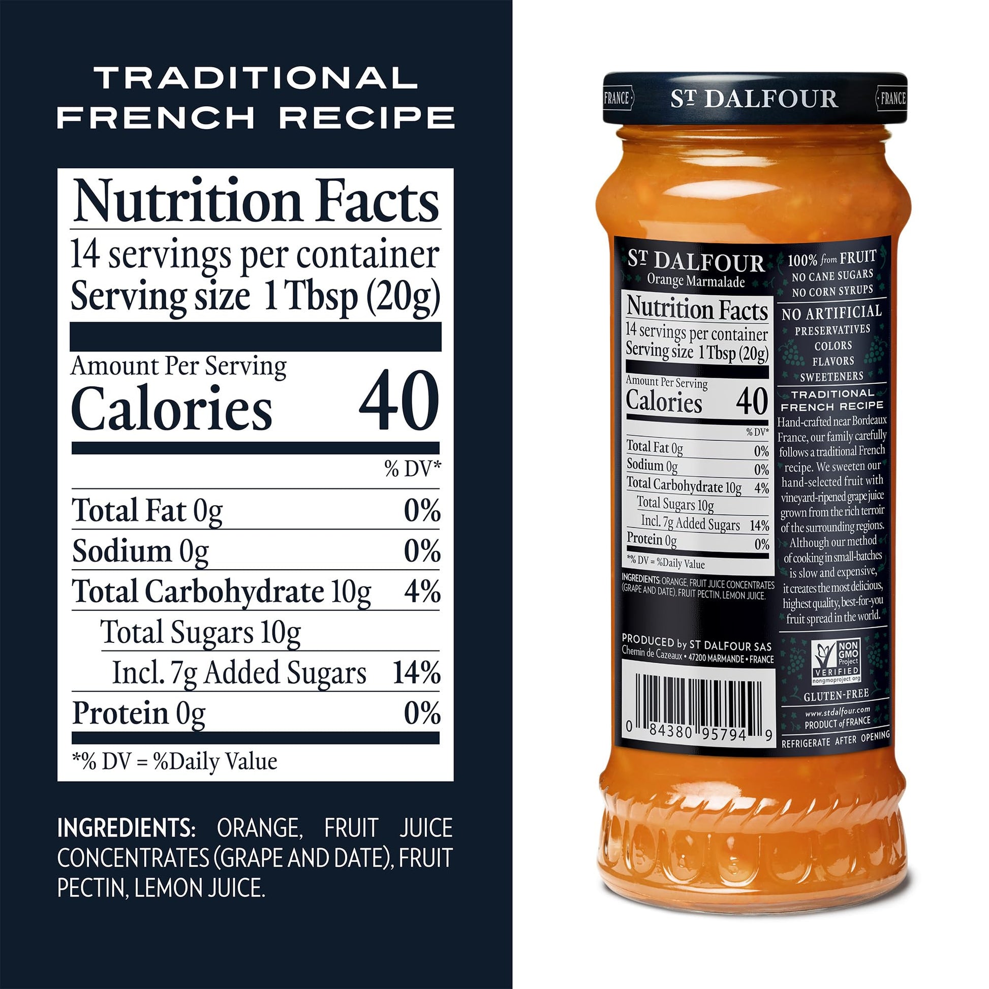 Q: What ingredients are in St. Dalfour Orange Marmalade?A: St. Dalfour Orange Marmalade is made with 100% fruit and is sweetened solely with fruit juice concentrates. It contains no artificial additives or added sugars, ensuring a pure and natural fruit spread.