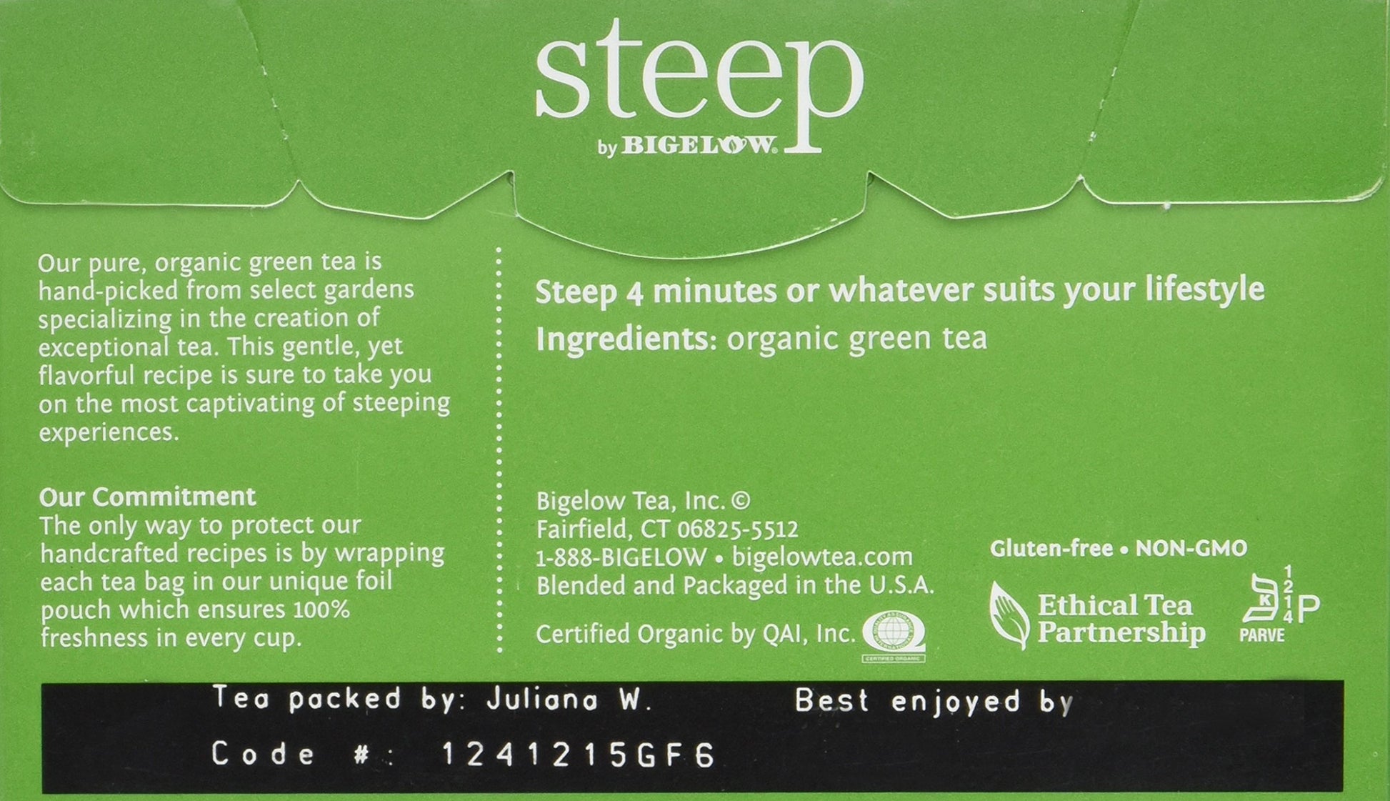 Don'T Settle For Boring Tea-Bigelowa Steep Teas Creatively Blend Exotic, On-Trend Ingredients In Unexpected And Uniquely Flavorful Ways. All Natural, Organic Teas. Non Gmo. Part Of A Fair Trade, Ethical Tea Partnership. Delicate Green Tea, With A Smooth, Delicious Flavor And A Hint Of Sweetness. Beverage Type: Tea, Flavor: Pure Green, Packing Type: Tea Bag, Capacity (Weight): 0. 91 Oz.