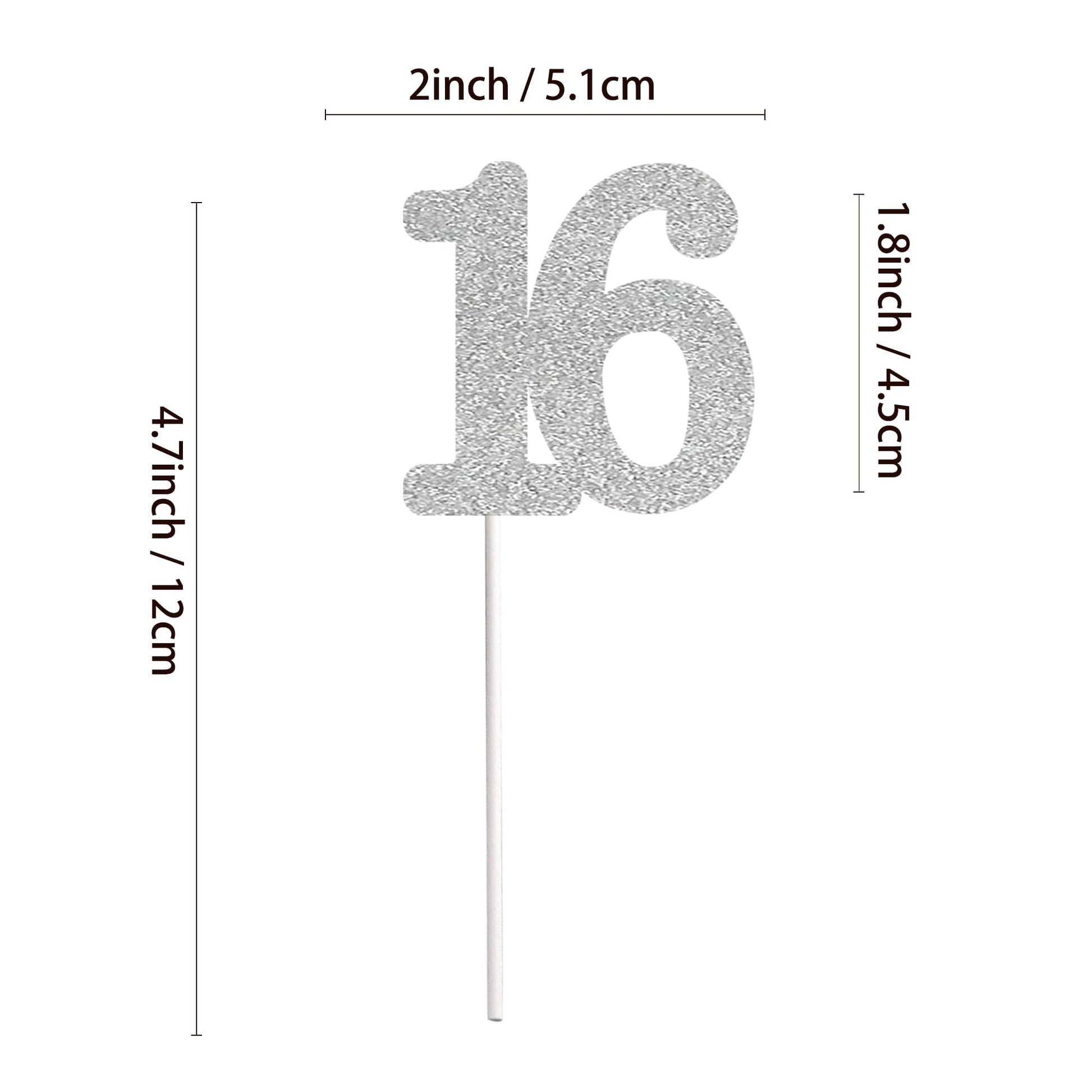 Q: What are the dimensions of the Sumerk 16th birthday cupcake toppers?A: The Sumerk 16th birthday cupcake toppers measure 5cm x 13cm (2 inches x 5.1 inches), including the stick.