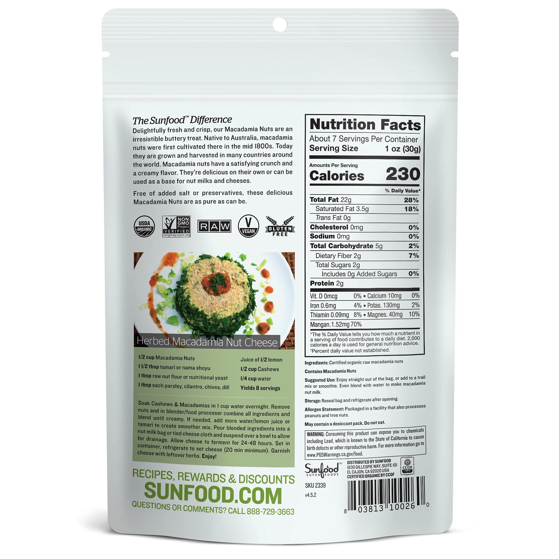 Q: What makes these macadamia nuts different from other brands?A: Sunfood's macadamia nuts are sustainably sourced from small organic farms in Australia and Kenya, processed at low temperatures to preserve delicate enzymes and nutrients, and are free from added salt, preservatives, or flavorings.