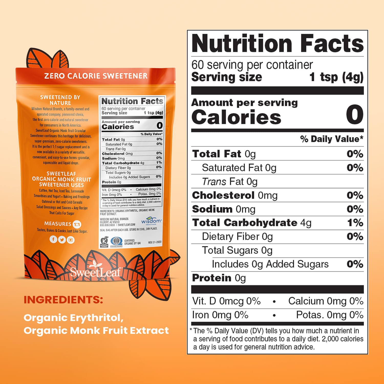 Q: What ingredients are in SweetLeaf Organic Monk Fruit Sweetener?A: SweetLeaf Monk Fruit Sweetener is made from organic monk fruit extract and organic erythritol, which is a naturally occurring sugar alcohol. This blend ensures it mimics the texture and taste of table sugar without any artificial additives.
