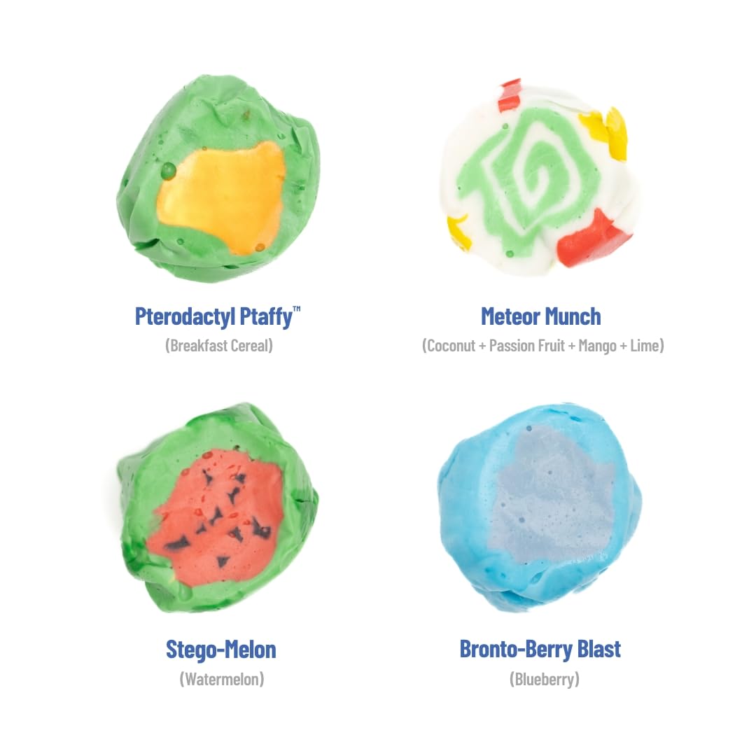 Q: What flavors are included in the Taffy Shop Dino Chew Taffy?A: The Taffy Shop Dino Chew Taffy features a variety of delicious flavors, each providing a unique taste experience that will satisfy your candy cravings. Enjoy the assortment of soft, chewy salt water taffy in every 7oz bag.