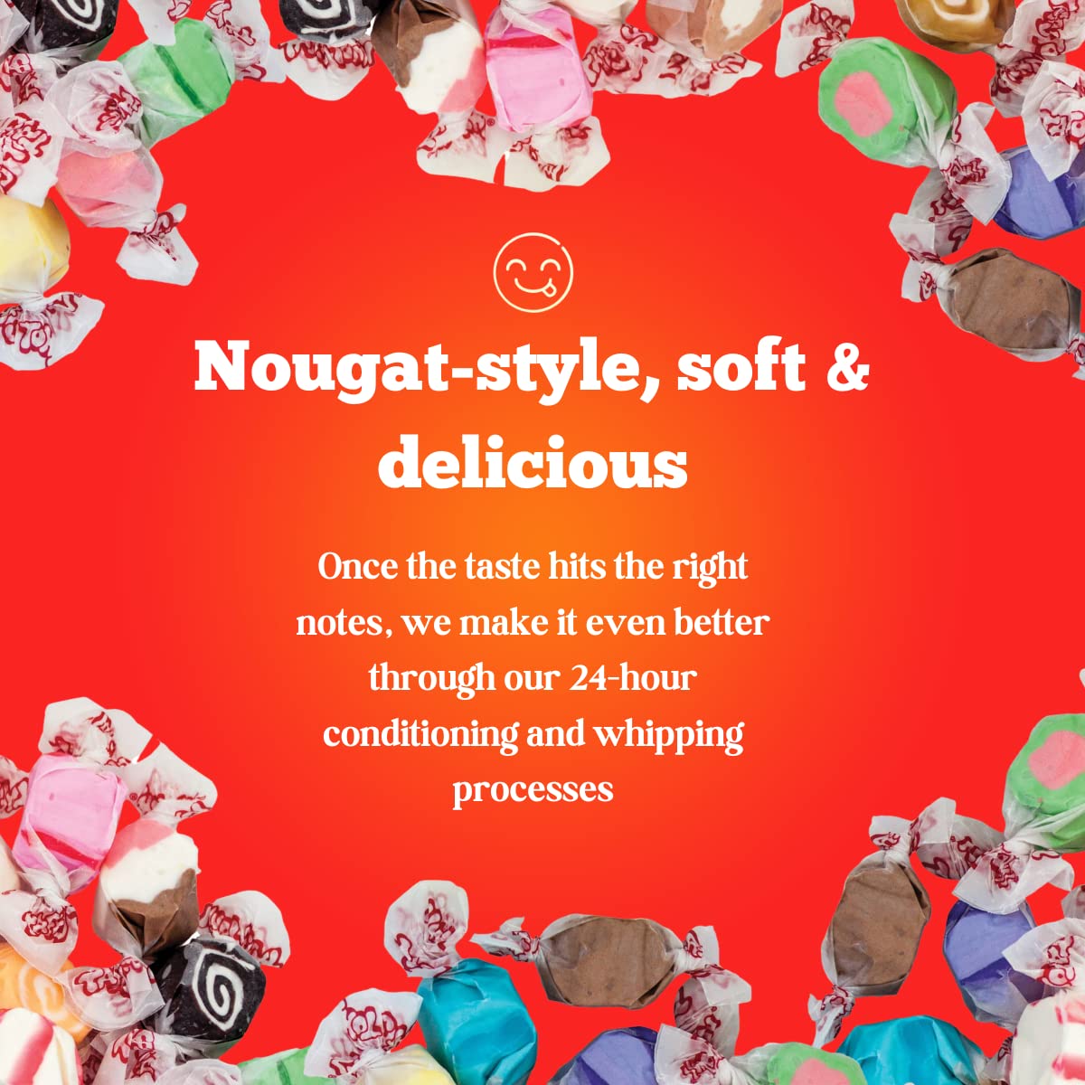 - Q: What makes Taffy Town Candies different from other taffy brands? A: Taffy Town Candies are uniquely crafted using a special 24-hour conditioning and whipping process, resulting in a gourmet salt water taffy that melts in your mouth. With over 80 true-to-life flavors, our taffy offers a variety that stands out from other brands.