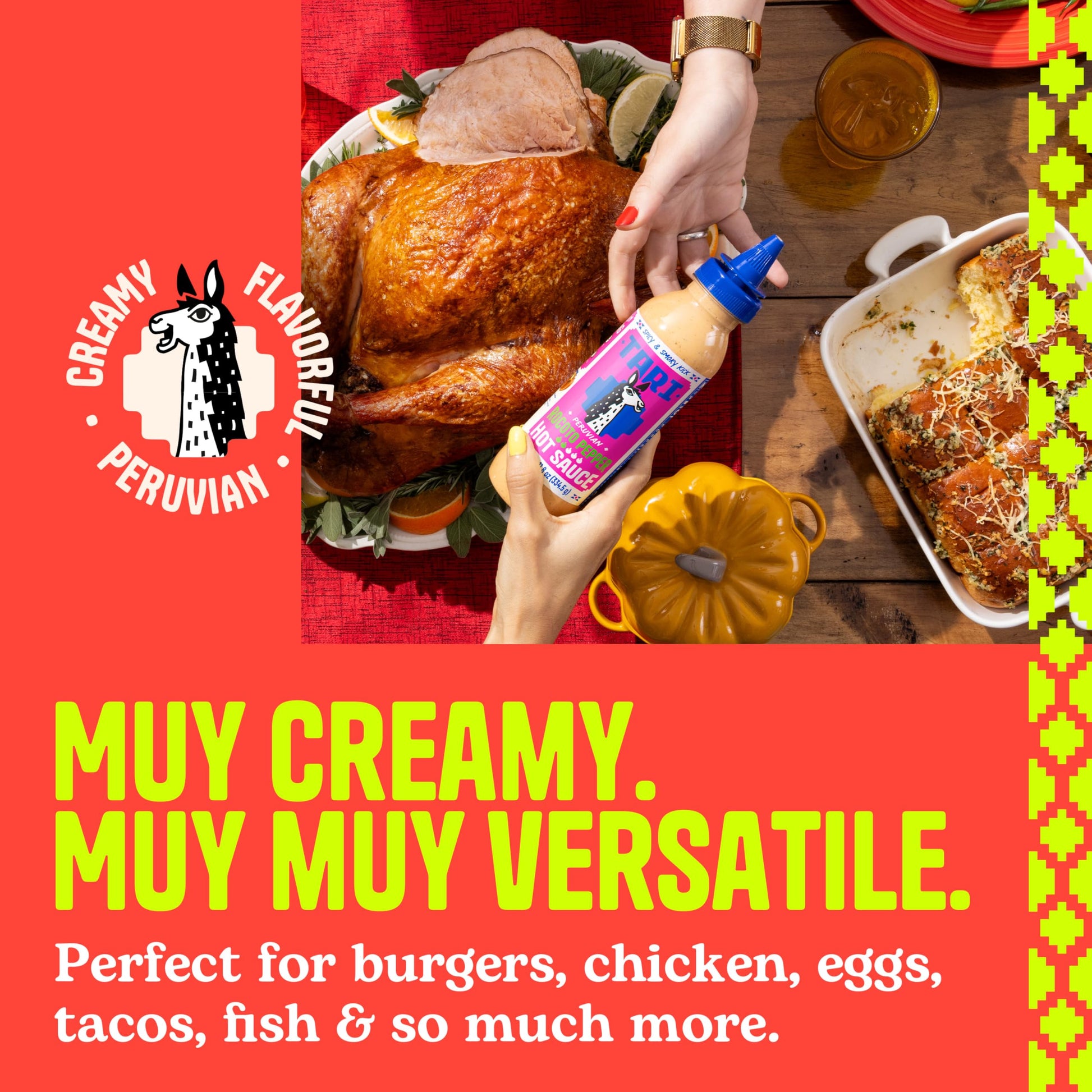 Dive into the creamy, spicy, and smoky delight of Tari’s Aji Rocoto Hot Sauce, the #1 hot sauce choice in Peru and a favorite for adventurous eaters everywhere. Our delicious hot sauce combines the fiery heat of aji rocoto with a silky texture that elevates any dish from ordinary to extraordinary. Perfect as a taco sauce, steak sauce, wing sauce, burger sauce, or chicken sauce, Tari is your go-to for adding a burst of flavor. Every dip, drip or drizzle of Tari Hot Sauce promises to make your meals sing with "¡Perfecto!" flair. Eat diferente with Tari Hot Sauce, crafted to inspire culinary creativity and add excitement to your favorite foods. Discover the best of Peru's renowned cuisine, perfectly packaged to spice up your eating adventures!