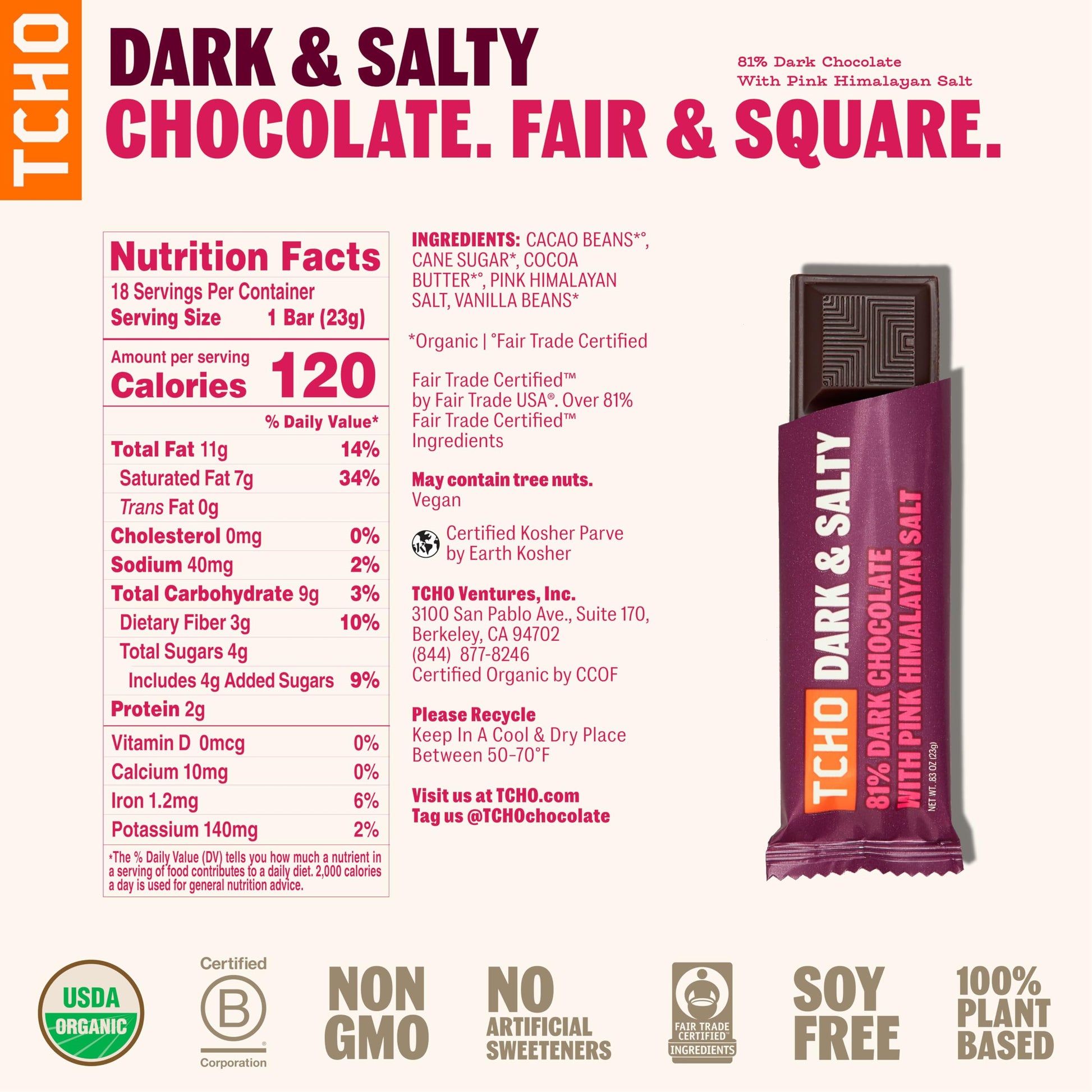 Q: What makes TCHO Dark & Salty Chocolate Bars unique?A: TCHO Dark & Salty Chocolate Bars stand out due to their organic 81% dark chocolate made with ethically sourced cacao and enhanced with Pink Himalayan Salt, offering a rich flavor and satisfying texture.