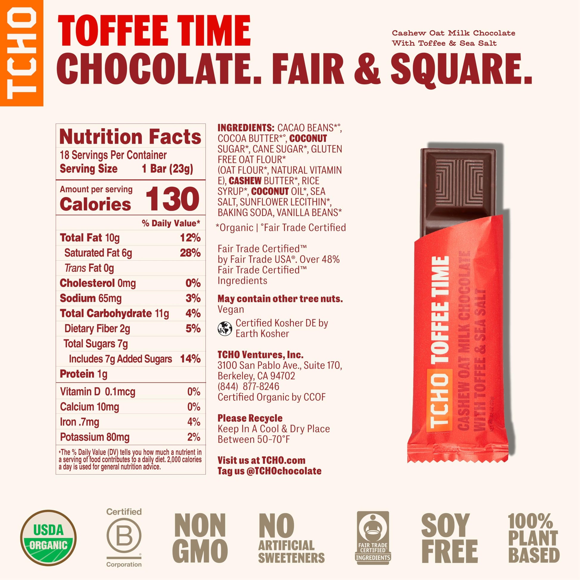 Indulge In The Delightful Taste Of Tcho Chocolate - Toffee Time Singles, Where Creamy Cashew Oat Milk Chocolate Meets Crunchy Toffee Bits And A Hint Of Sea Salt. Each Bite Offers A Perfect Balance Of Sweet And Salty Flavors, Crafted With 100% Vegan Chocolate Ingredients To Cater To Your Dietary Needs. Enjoy The Rich, Satisfying Experience Of Fine Cacao While Treating Yourself To A Guilt-Free Indulgence Thats Perfect For Snacking Or Sharing. Elevate Your Chocolate Experience With Tchos Commitment To Quality And Flavor In Every Bar.