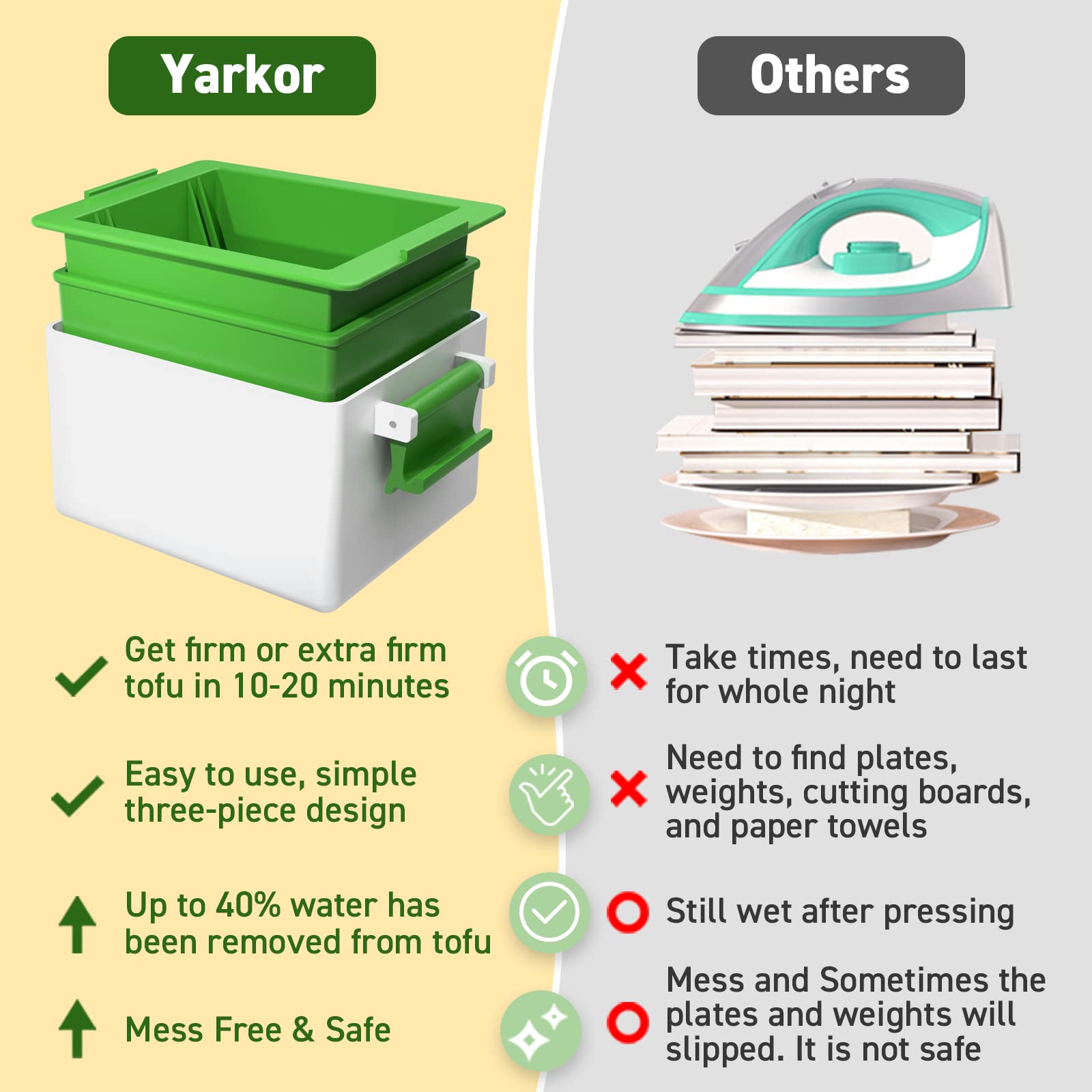 Q: How does the Yarkor Tofu Press improve the taste of tofu?A: The Yarkor Tofu Press effectively removes excess water from tofu, allowing it to absorb marinades and spices better. This results in a firmer texture and enhanced flavor, making your tofu dishes more delicious.