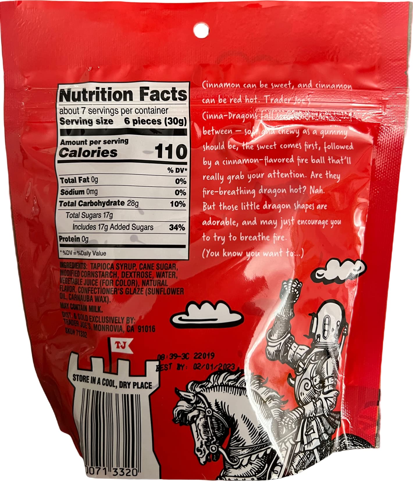 Q: What are Trader Joe's Cinna-Dragons made of?A: Trader Joe's Cinna-Dragons are soft and chewy gummy candies flavored with cinnamon, offering a unique spicy twist to traditional gummies. Their ingredients include sugar, corn syrup, and natural flavors.