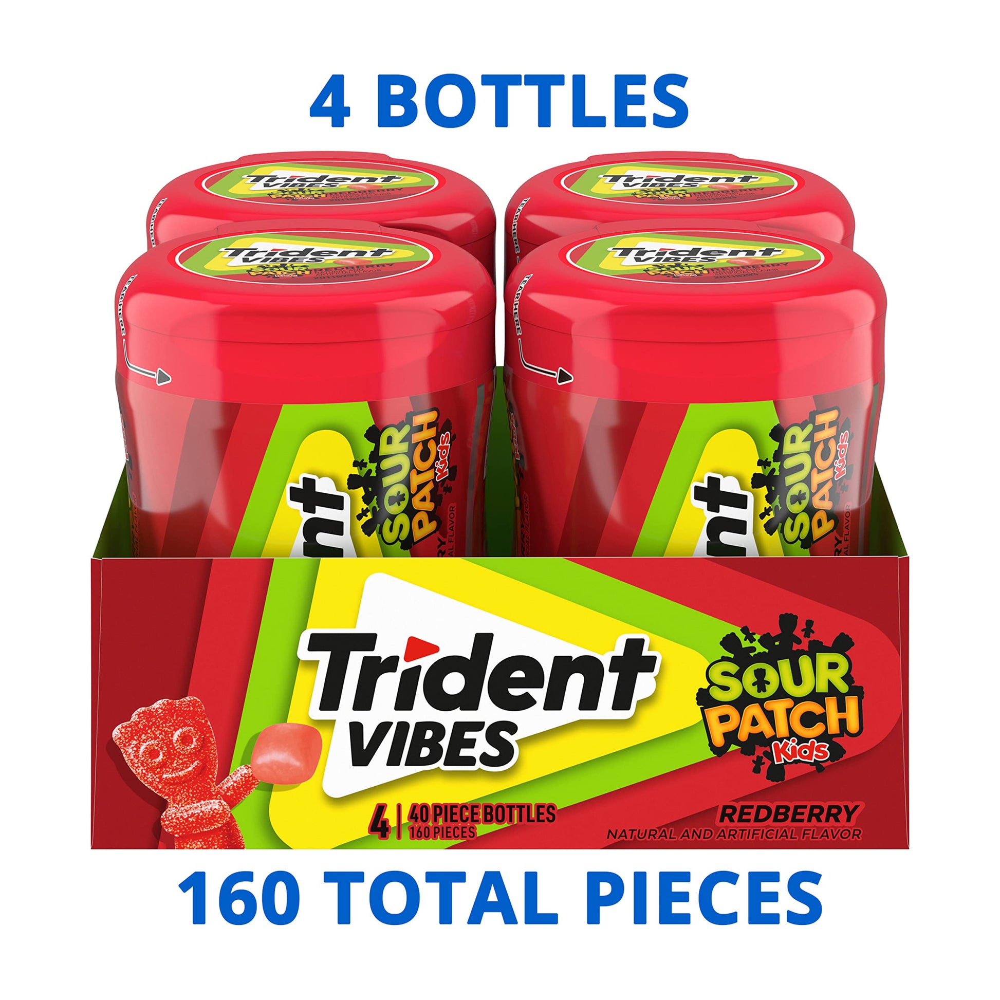 Trident Vibes SOUR PATCH KIDS Redberry Gum packs all the fun of your favorite sour candy into a sugar free gum. With 35% fewer calories than sugared gum, this sugarless gum has only 5 calories per piece and is coated with a crunchy candy-like shell thats packed with the irresistible SOUR THEN SWEET flavor of SOUR PATCH KIDS candy. Instead of packs of gum, Trident Vibes flavored gum is packaged in a convenient bottle, making it easy to stash almost anywhere. Keep a bottle of Trident Vibes SOUR PATCH KIDS gum in your desk, purse, car, travel pack or anywhere else you might crave a piece of fruit gum. Sugarless bulk gum packs with xylitol are perfect for sharing with friends or coworkers or for stocking your home or small business. Whenever you need a long lasting chew, choose Trident Sugar Free Chewing Gum.