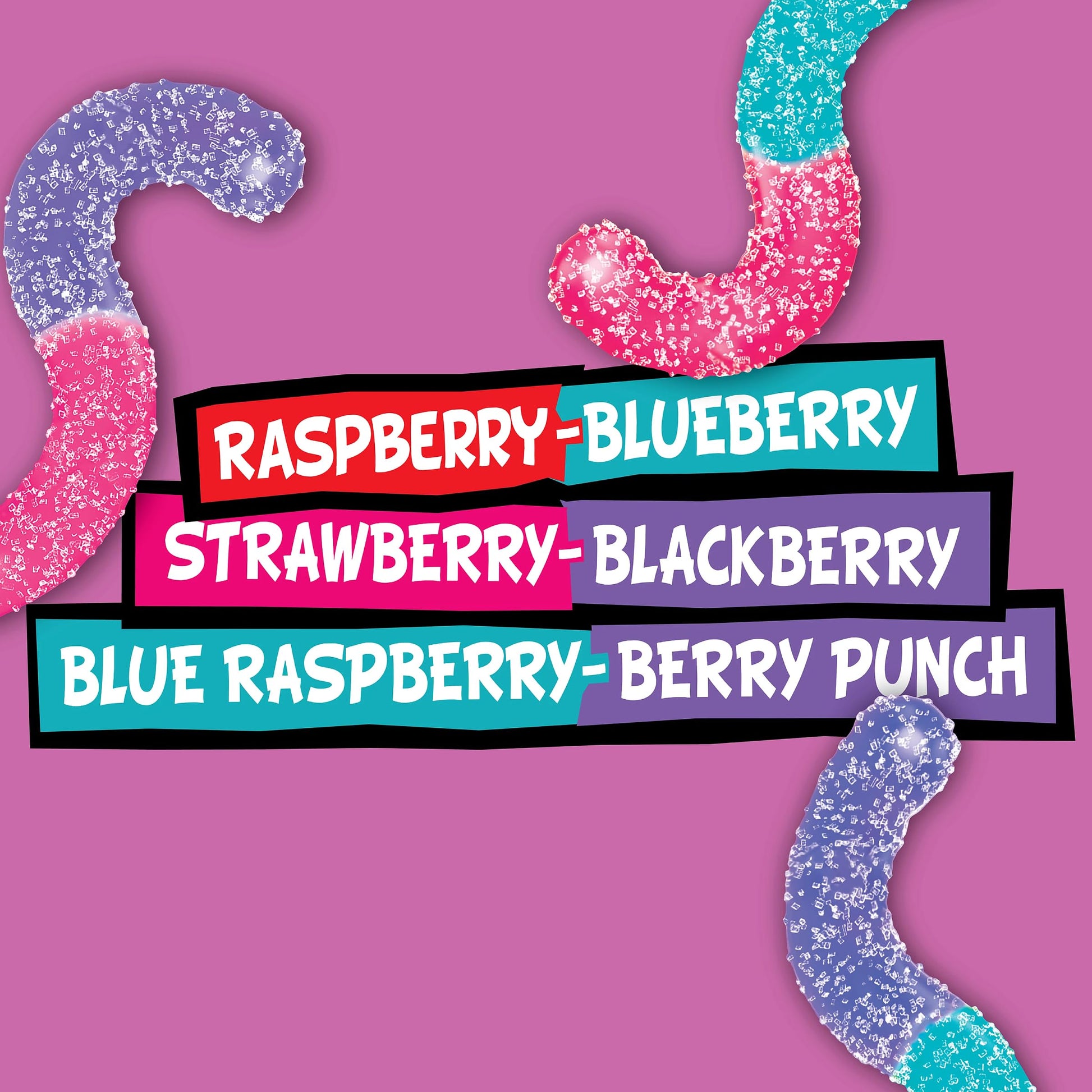 Q: What flavors are included in Trolli Sour Brite Crawlers Very Berry?A: Trolli Sour Brite Crawlers Very Berry features a delicious combination of flavors, including raspberry-blueberry, strawberry-blackberry, and blue raspberry-berry punch.