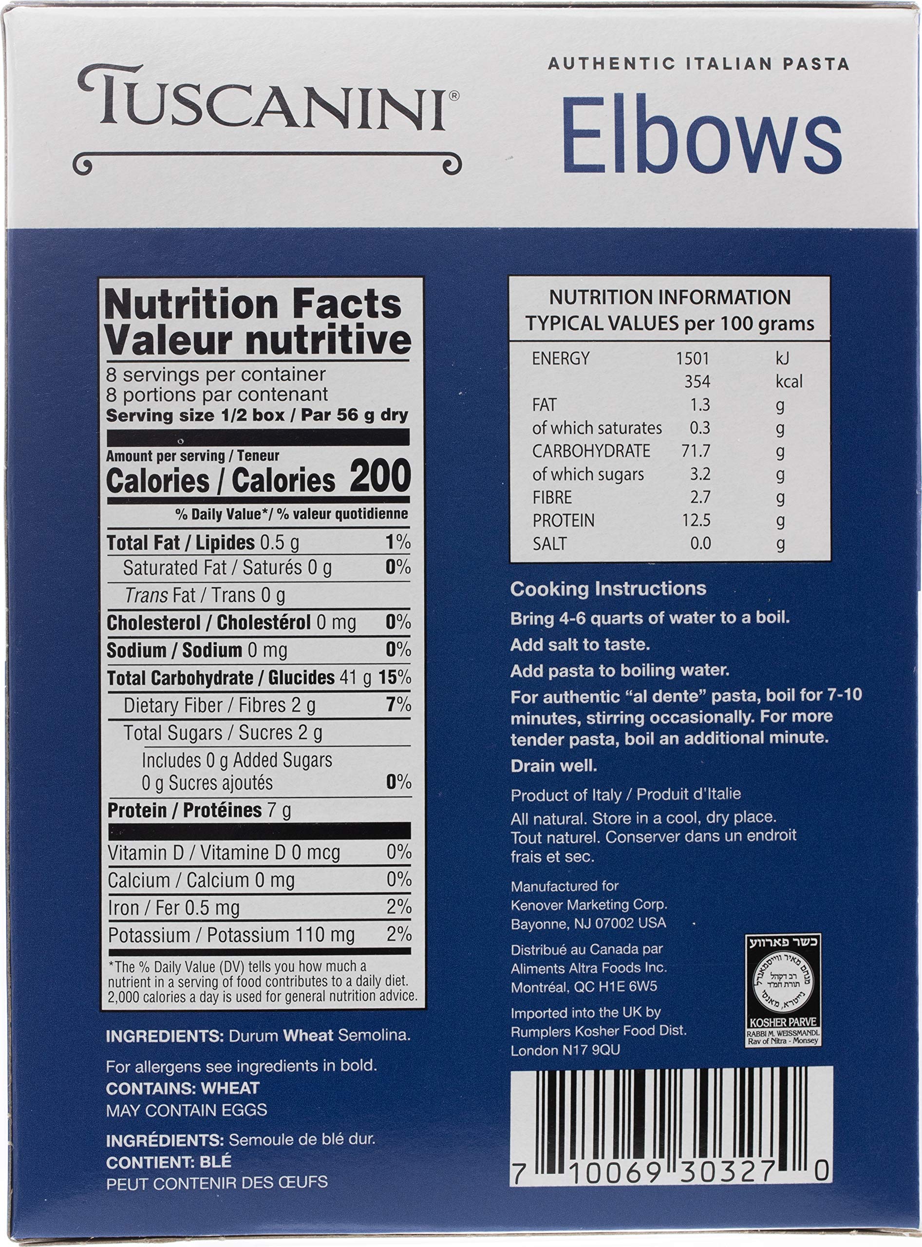 Q: Is Tuscanini Elbow Macaroni Pasta suitable for special diets?A: Yes, Tuscanini pasta is certified kosher and contains no artificial flavors or ingredients, making it suitable for those following kosher dietary guidelines and for consumers looking for natural pasta options.