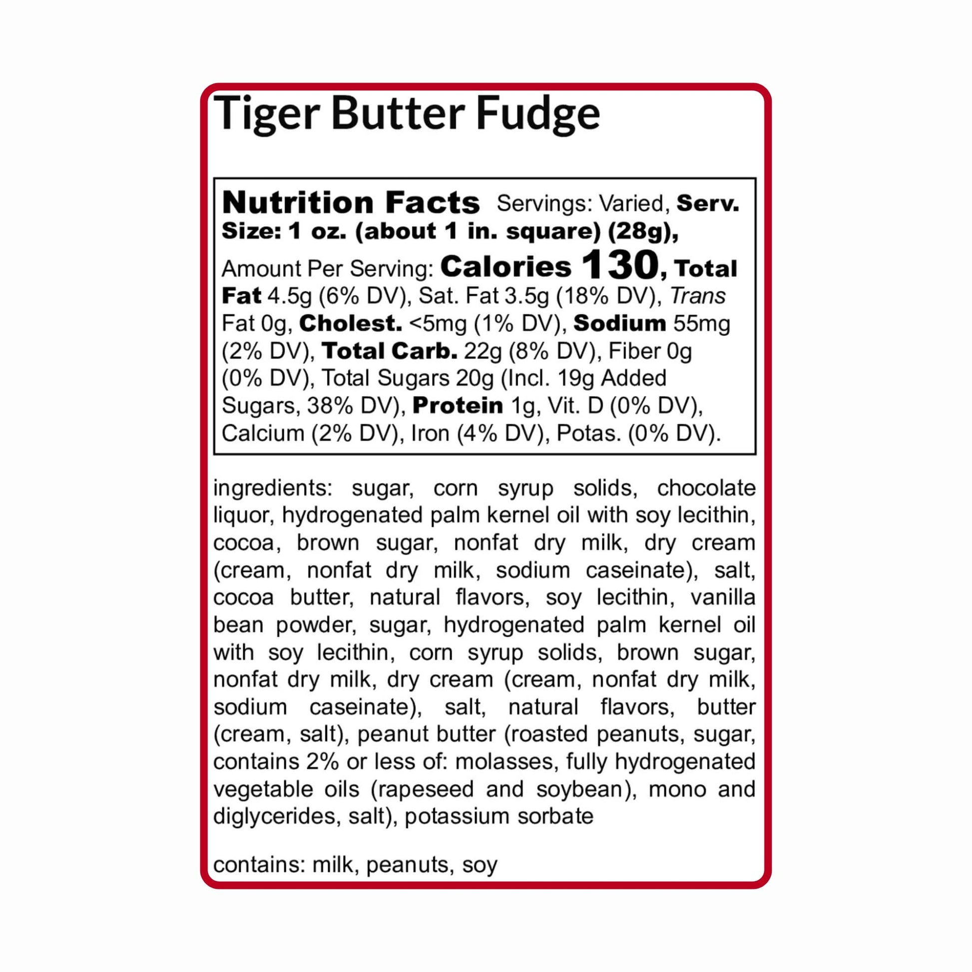 - Q: Are there any allergens in Uncle Butch's Tiger Butter Fudge? A: Yes, please note that Uncle Butch's Tiger Butter Fudge may contain trace amounts of nuts, milk proteins, gluten, and peanuts, as these ingredients are used in the same facility. If you have allergies, please take caution before consuming.