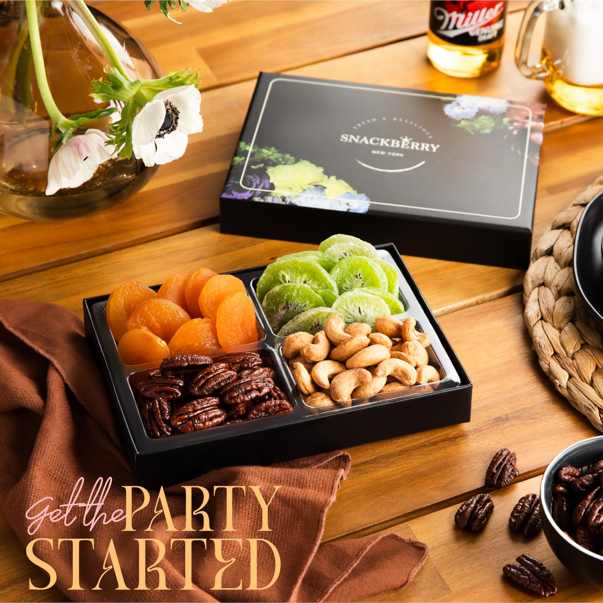Our Sectional Party Tray Is Filled To The Brim With Healthy Goodies. The Lidded Tray Is Divided Into 4 Compartments For Your Convenience. Each Includes A Different Mouthwatering Nut From Our Premium Assortment. Whether Gifting Yourself, A Loved One, Or A Friend, This High-End Eye-Catching Gourmet Food Gift Basket Will Surely Complement And Enhance All Celebrations. Our Nut And Dried Fruit Platter Gift Includes A Stunning Box, Guaranteed To Leave Your Recipient Satisfied And Thrilled. Whether Celebrating Dad, Mom, Girlfriend, A Birthday, Or Simply Saying Thank You, Gift With Absolute Confidence! Buying Presents Is Usually Pretty Stressful. When You Think Youve Found The Perfect Gift, Its Expensive. When You Find An Affordable One, You Dont Like It As Much. Lucky For You Our Nut & Dried Fruit Gift Box Is Both High-End And Affordable, Exactly What You Were Looking For!