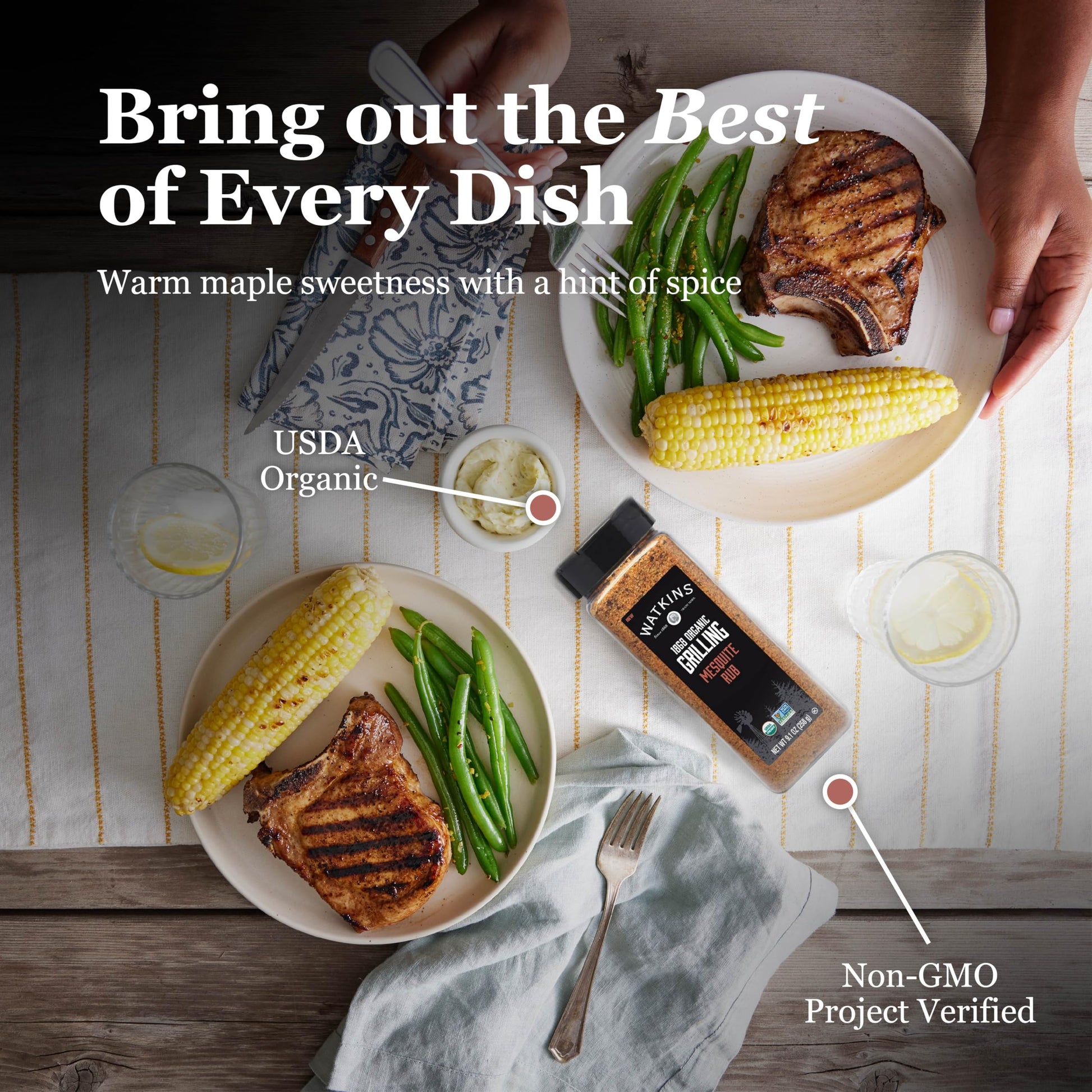 - Q: How should I use Watkins Organic Grilling Mesquite Rub for the best flavor? A: For optimal flavor, generously apply Watkins Organic Grilling Mesquite Rub to your meat or vegetables at least 30 minutes before grilling. This allows the spices to penetrate the food, enhancing the overall taste. It's perfect for chicken, beef, pork, or even vegetables.