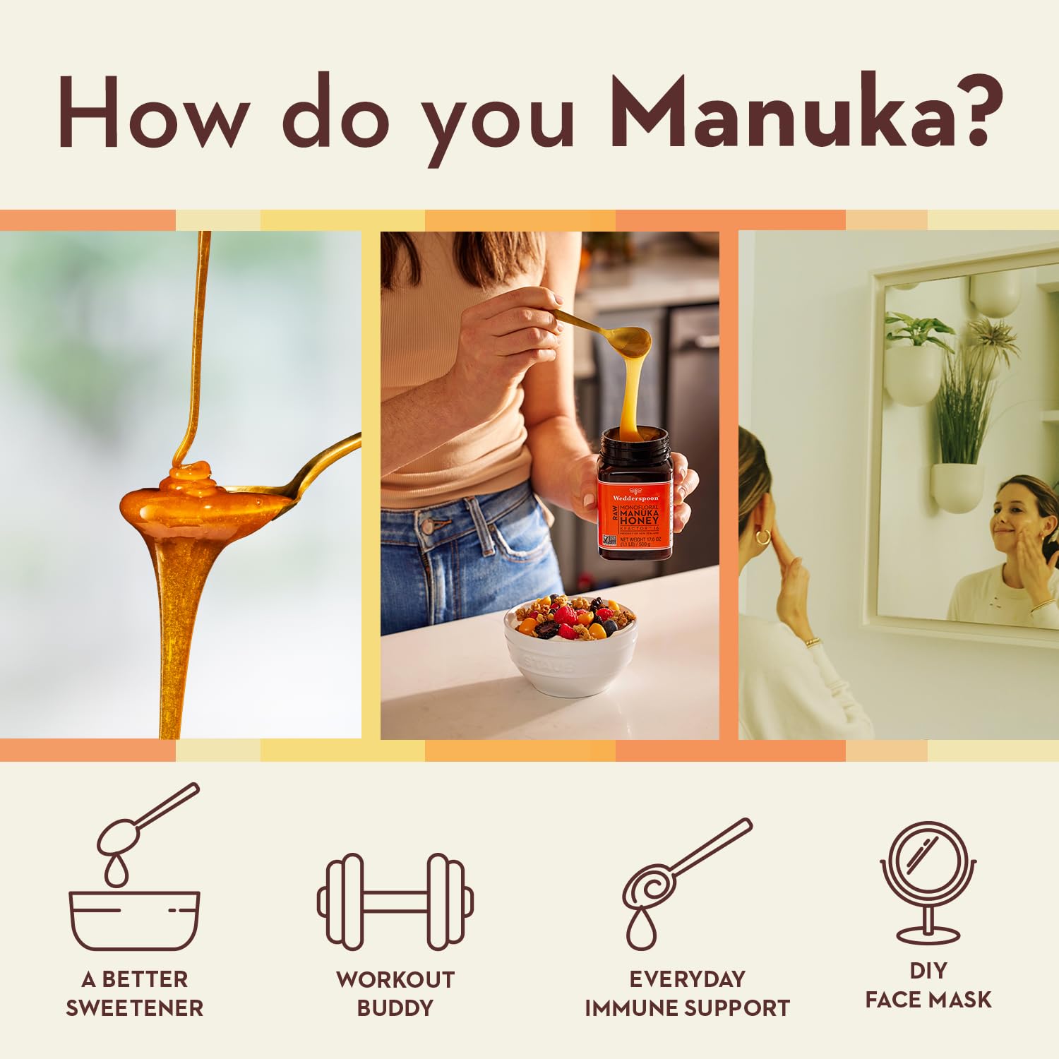 - Q: How do I use Wedderspoon Raw Premium Manuka Honey? A: You can use Wedderspoon Raw Premium Manuka Honey in various ways. It can be taken by the spoonful for a natural energy boost, added to smoothies, or used as a natural sweetener. Additionally, it can be applied topically as a DIY face mask for skin nourishment.