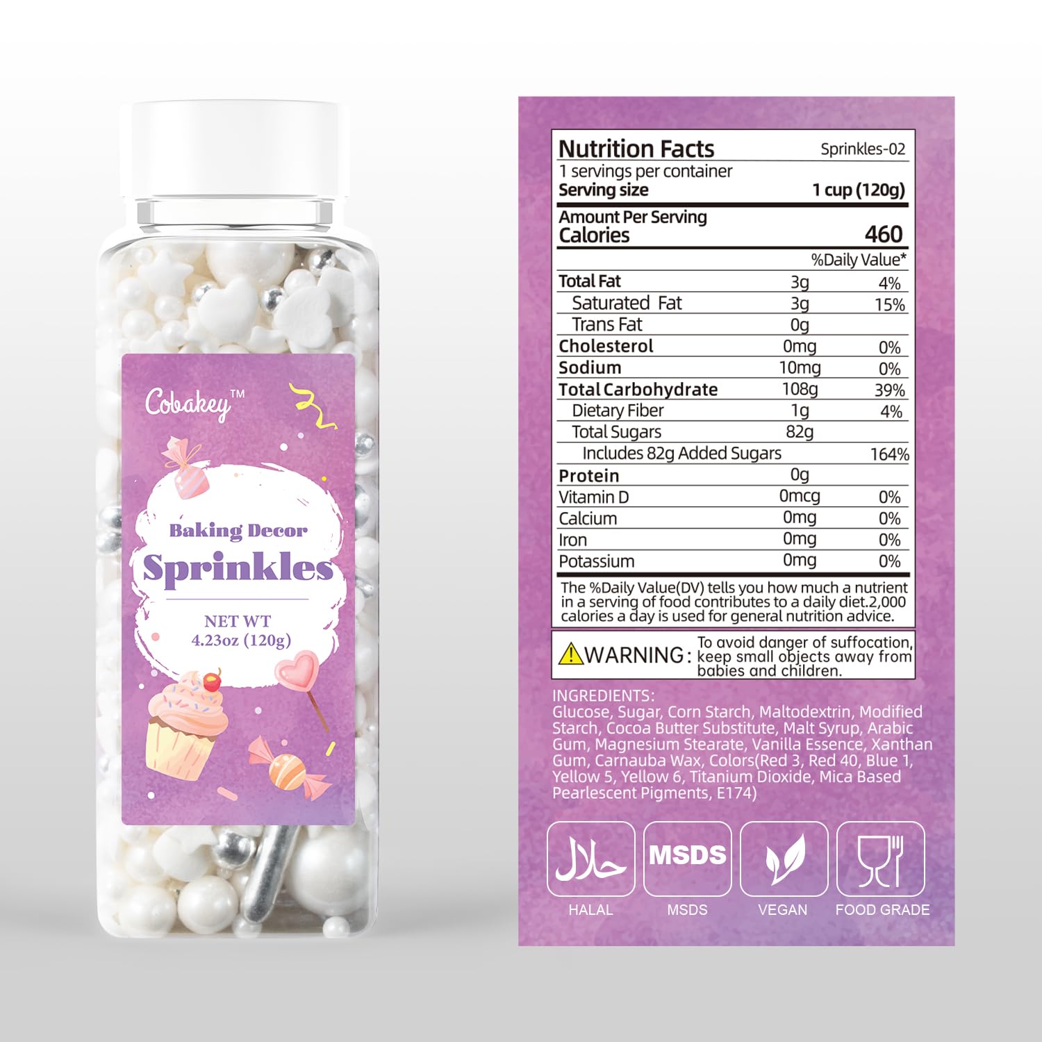 Pearl Sprinkles: Each Bottle Weighs 4.23Oz, 120G. Our Silver & White Sprinkles Are Made From Safe Ingredients. Our Cake Sprinkles Are In Different Shapes Of Heart And Pearl Sprinkles.
