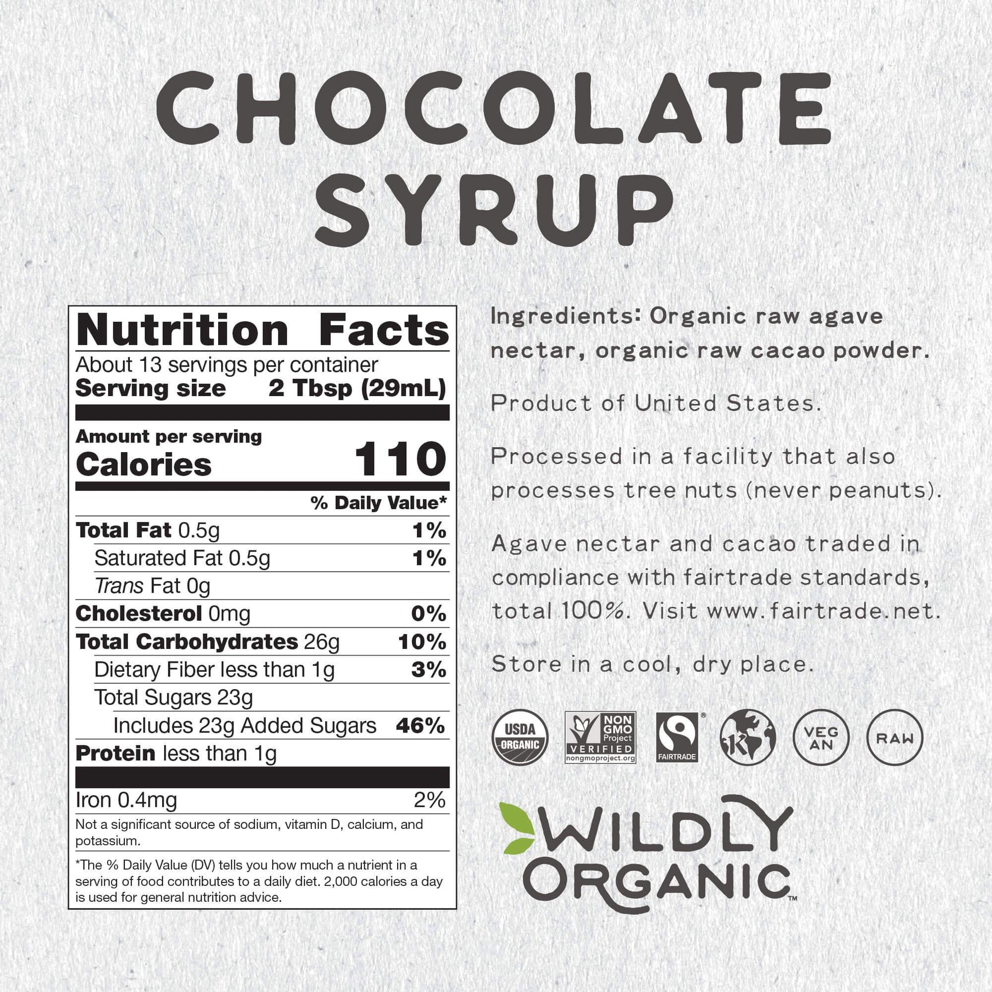- Q: What are the main ingredients in Wildly Organic Chocolate Syrup? A: Wildly Organic Chocolate Syrup is made from only two ingredients: Raw Cacao Powder and Raw Agave. Both ingredients are USDA Organic and Certified Fair Trade, ensuring a premium quality chocolate syrup.