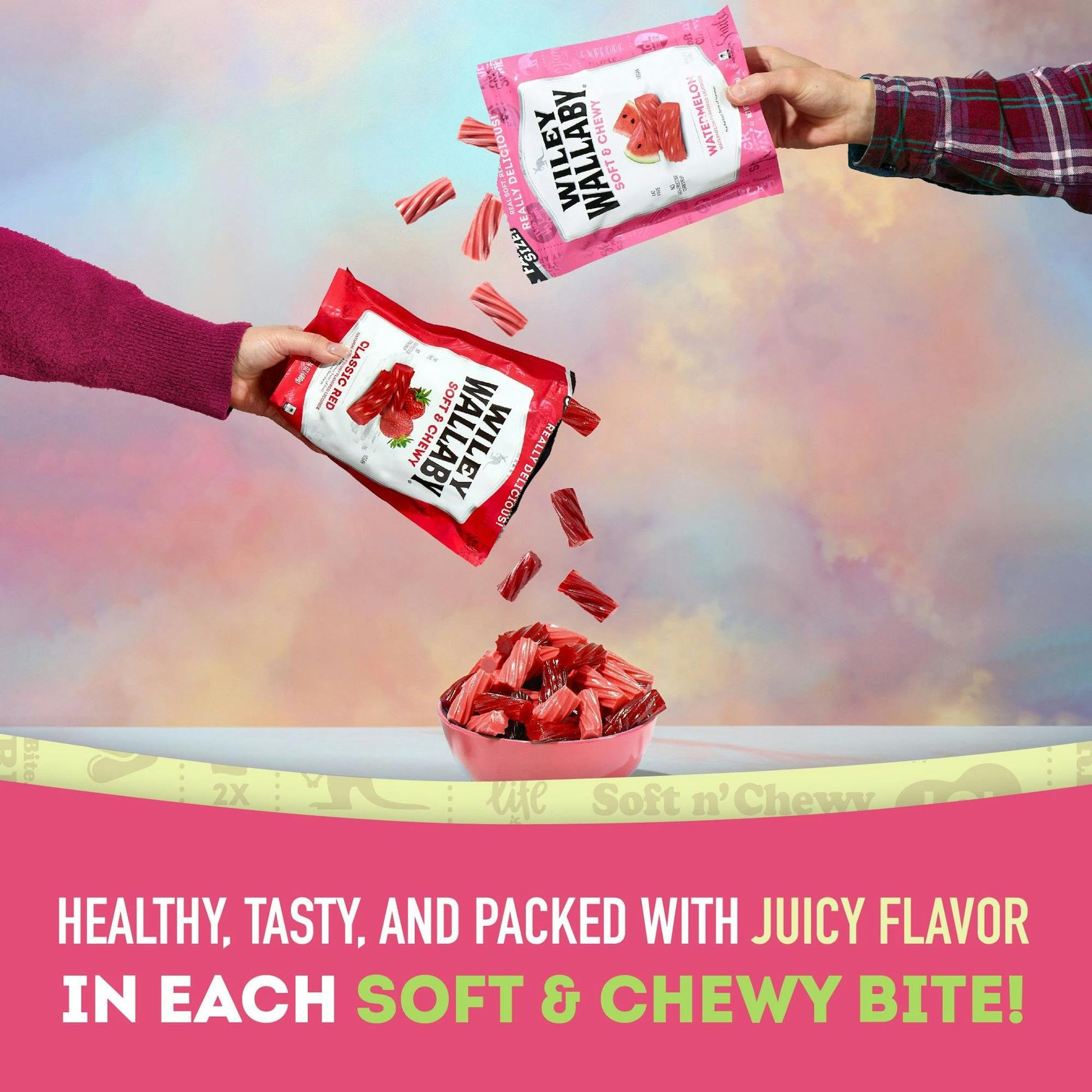 Q: What flavors are included in the Wiley Wallaby licorice variety pack?A: The Wiley Wallaby licorice variety pack includes a delightful mix of watermelon and strawberry flavors, ensuring a burst of fruity taste in every bite.