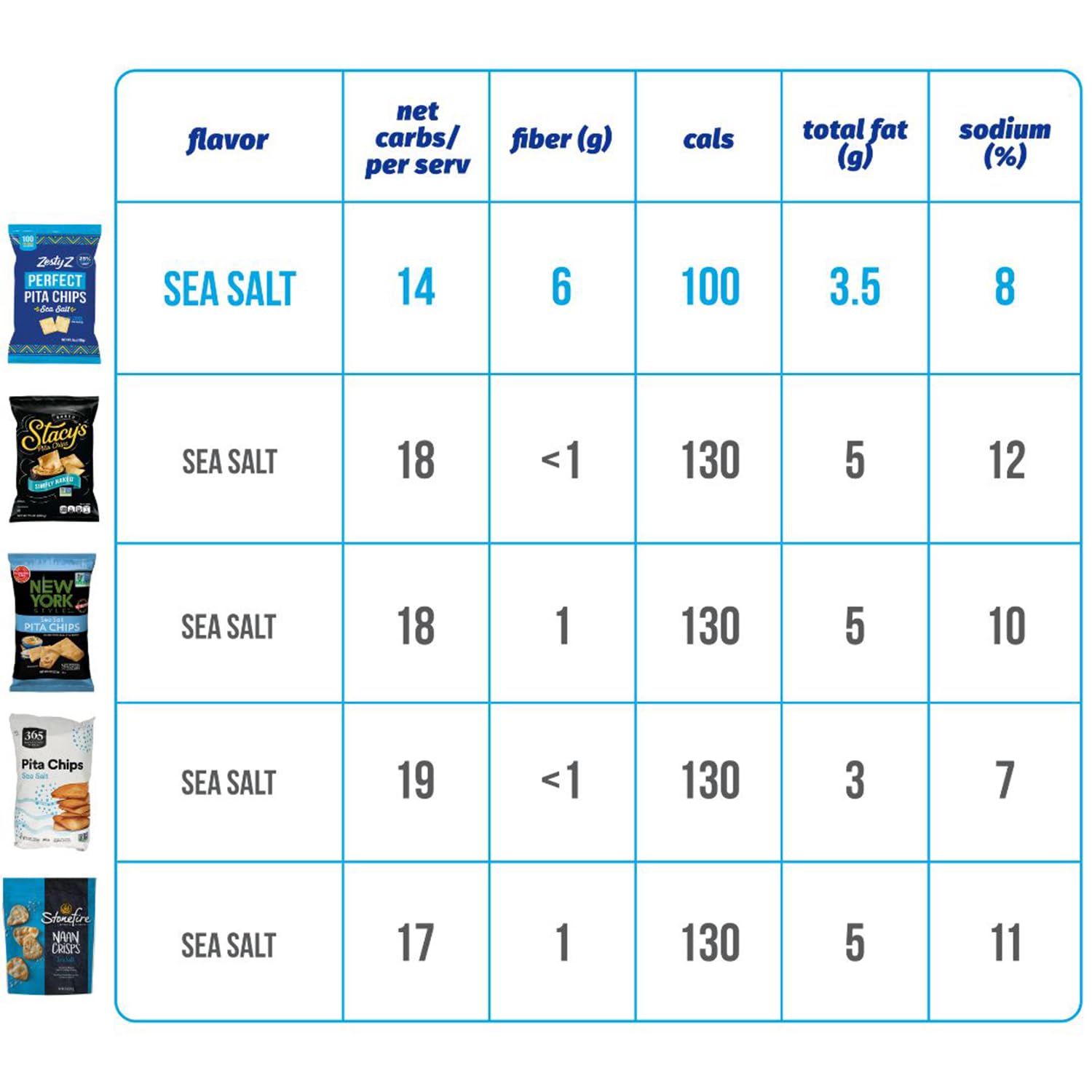 Q: What makes Zesty Z Pita Chips a healthier snack option?A: Zesty Z Pita Chips are a healthier snack option because they contain 25 percent fewer net carbs and 30 percent less fat compared to leading pita chip brands. With only 100 calories per serving and 6g of fiber, they help you feel full longer while providing a delicious alternative to traditional snacks.