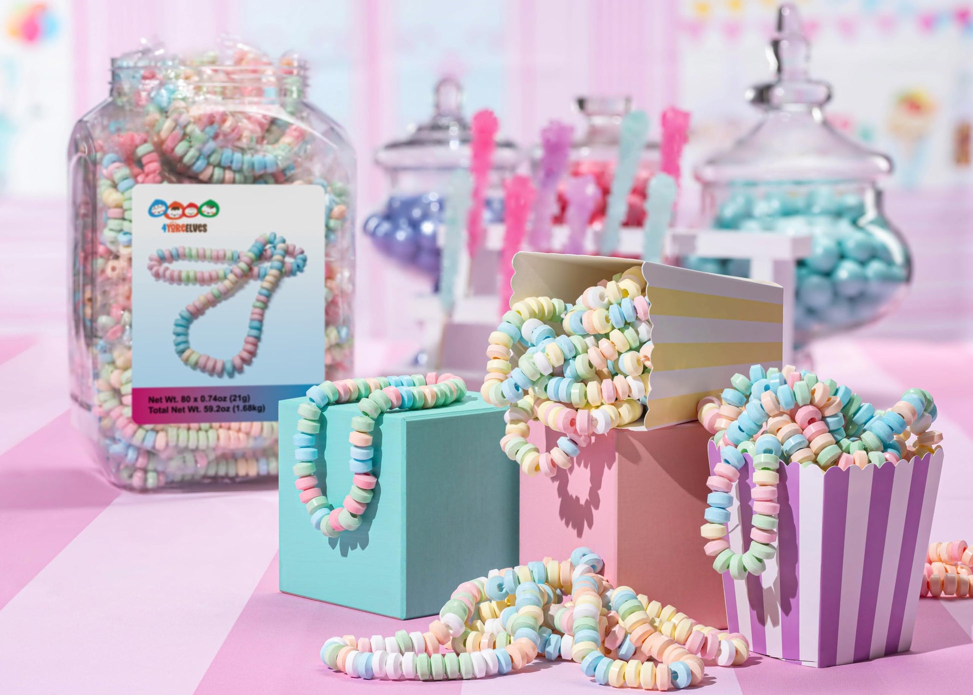 Q: Can candy necklaces be used for party decorations?A: Absolutely! Candy necklaces can be used as colorful decorations for pastel-themed parties, or as playful centerpieces that add a nostalgic touch to your candy buffet.