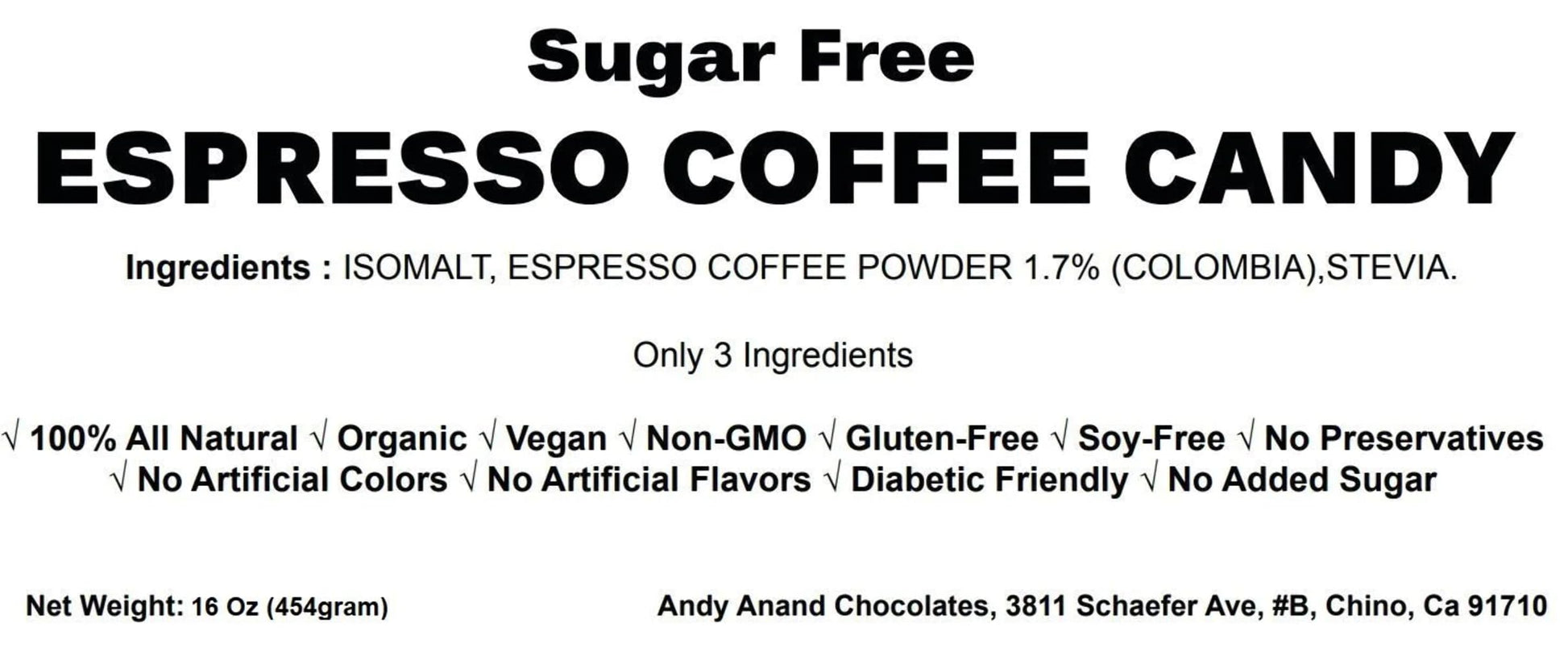 Q: Is the Andy Anand Sugar Free Espresso Coffee Candy suitable for diabetics?A: Yes, the Andy Anand Sugar Free Espresso Coffee Candy is sweetened with natural stevia, making it an excellent option for diabetics who want to enjoy a sweet treat without the added sugar.