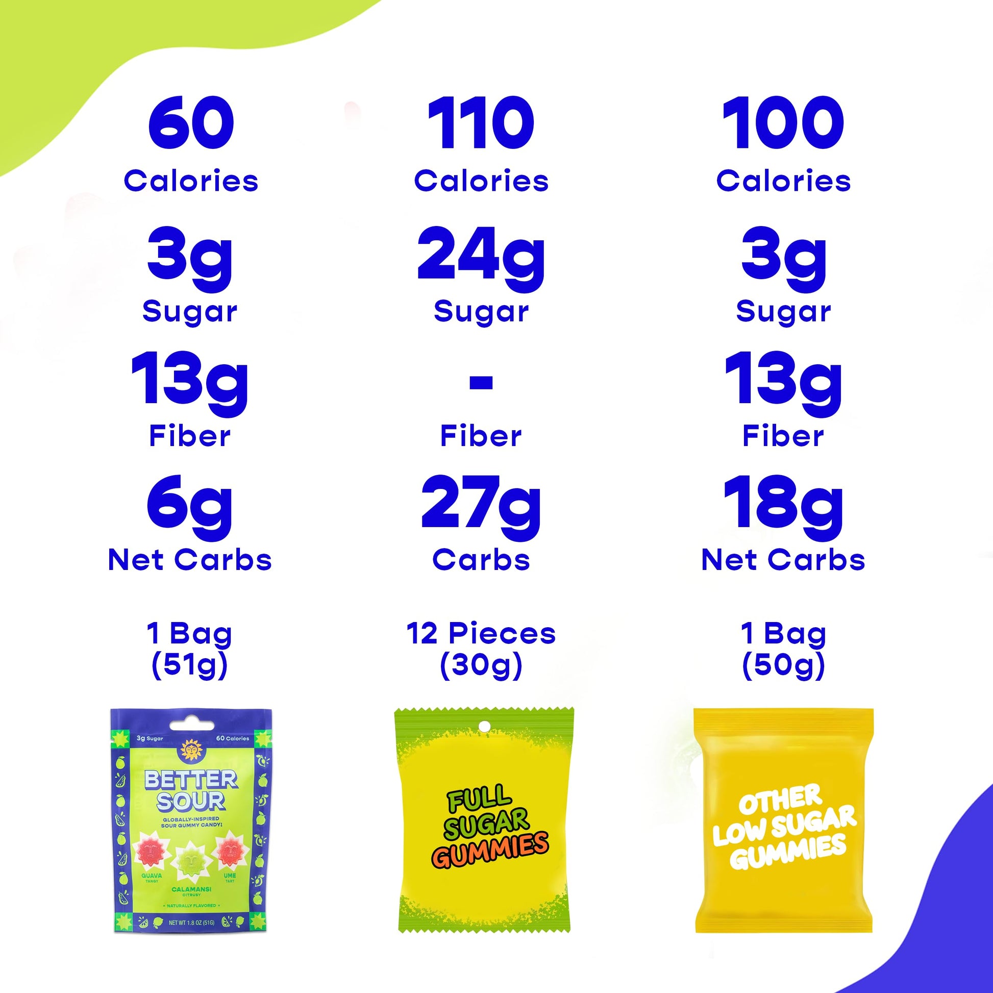 Q: How many calories and sugar are in Better Sour Gummies?A: Each bag of Better Sour Gummies contains only 60 calories and 3g of sugar, making them a low-calorie and low-sugar treat you can enjoy without the guilt.
