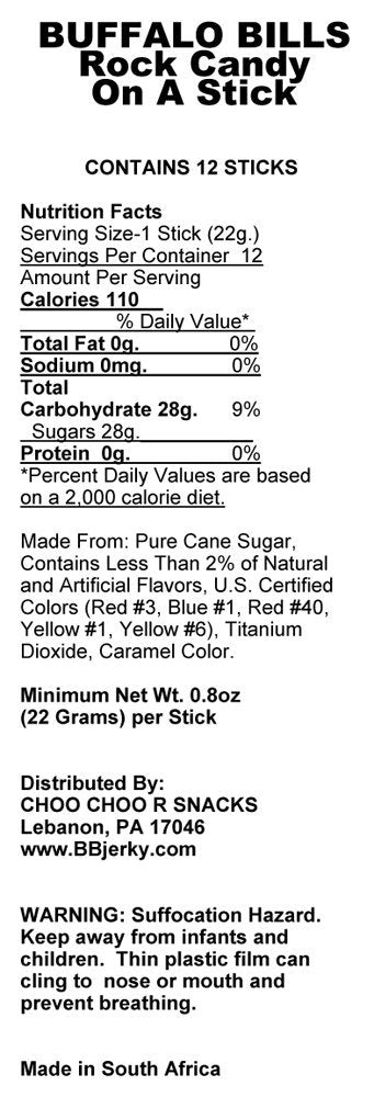 Q: What flavors do the Buffalo Bills Rock Candy On A Stick come in?A: The Buffalo Bills Rock Candy On A Stick features a delightful cotton candy flavor, perfect for adding a sweet touch to your celebrations.
