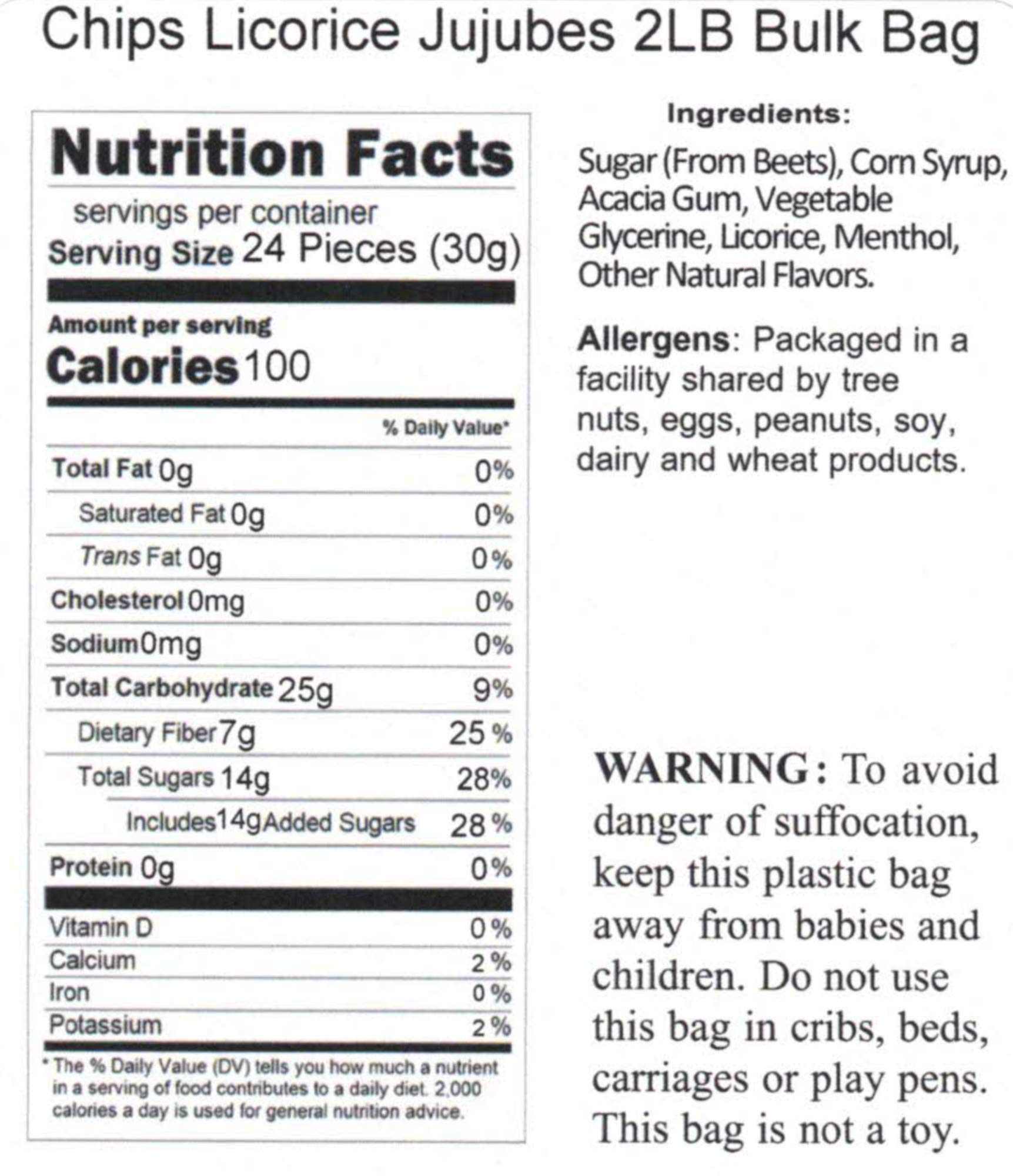 - Q: How many pieces are in a 2LB bulk bag of Chips Licorice Jujubes? A: Each 2LB bulk bag of Chips Licorice Jujubes contains approximately 940 pieces, making it a great option for sharing or enjoying over time.