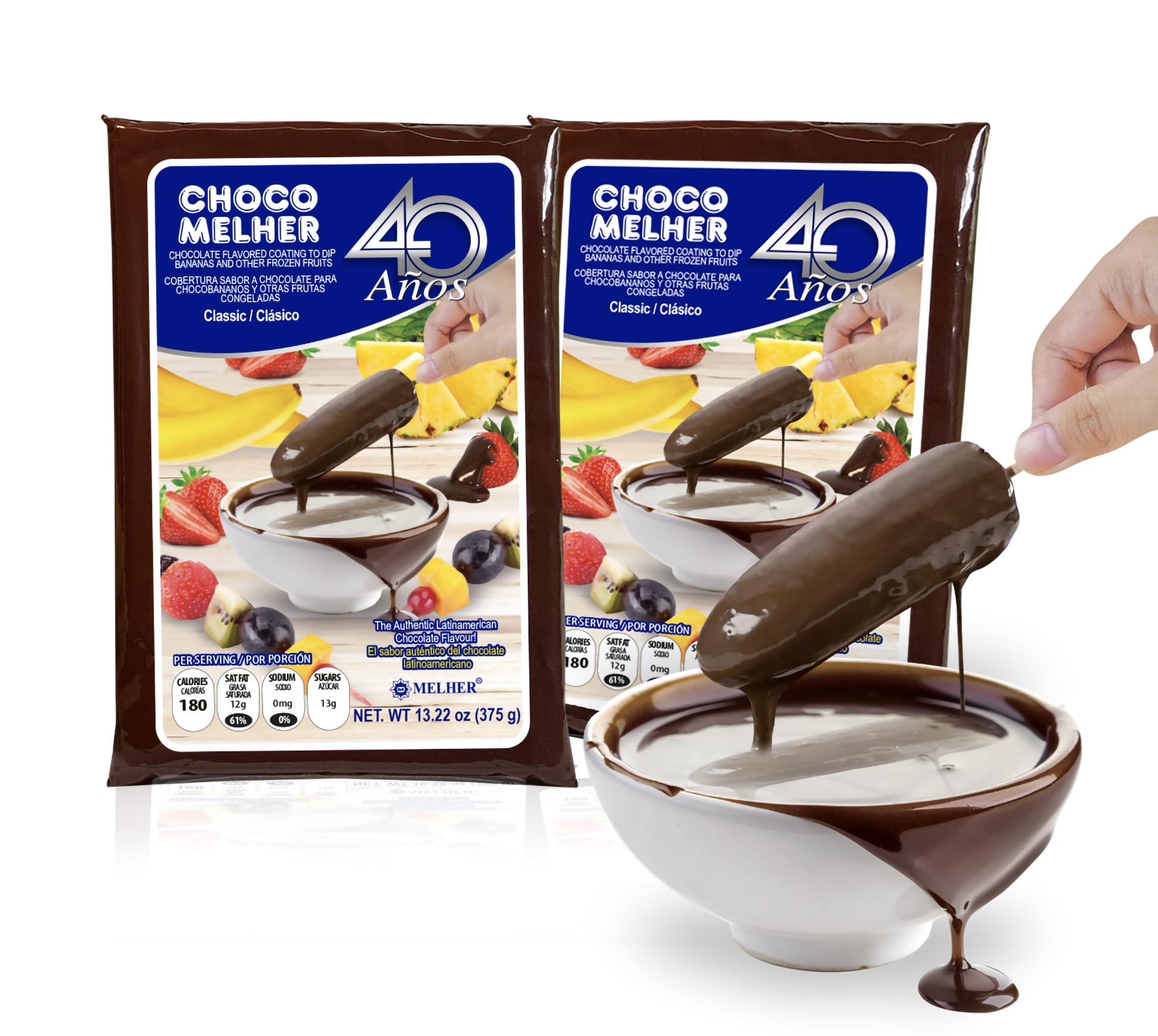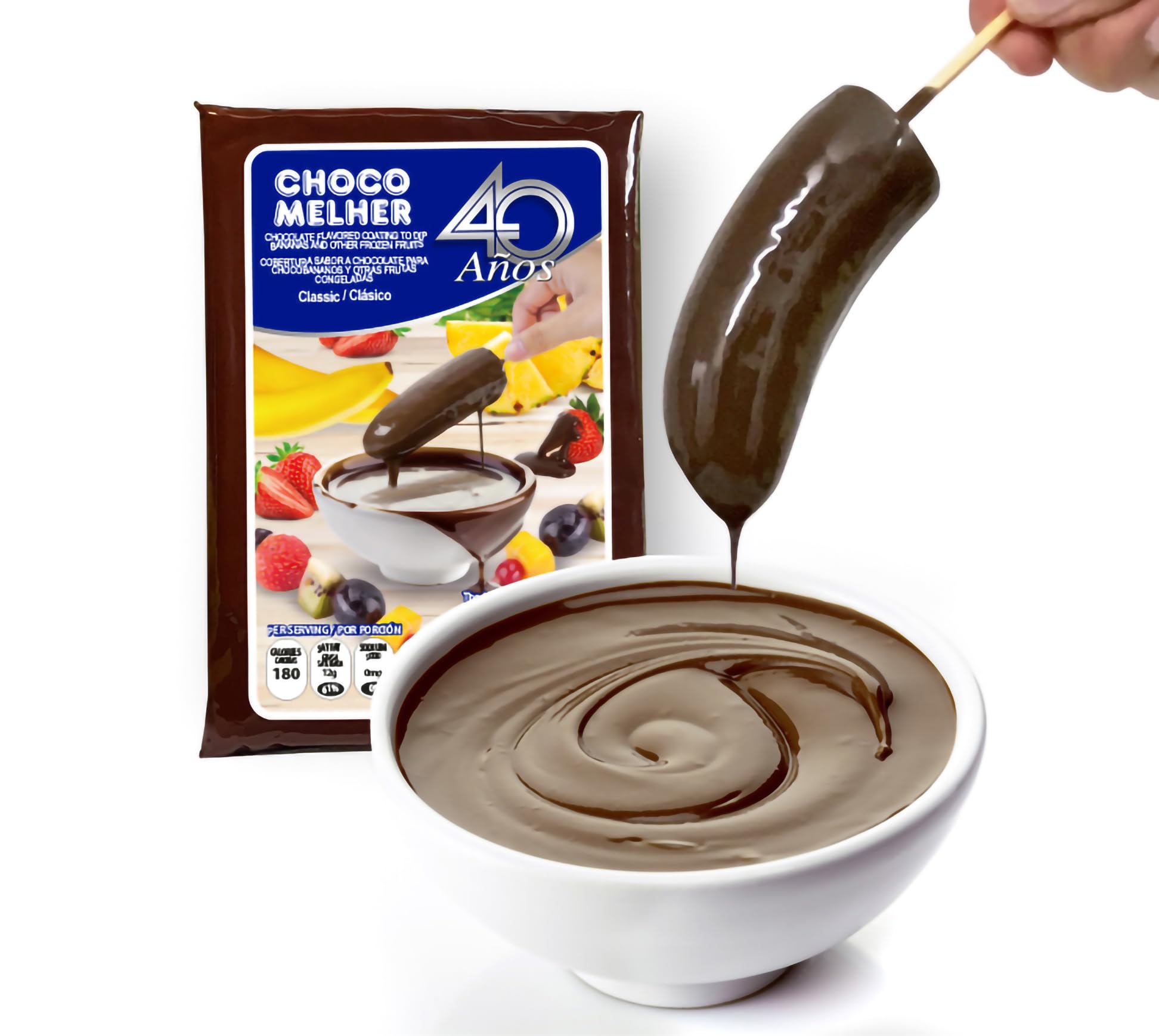 Q: What is Chocomelher Clasico and how is it used?A: Chocomelher Clasico is a compound chocolate coating specifically designed for covering frozen fruits like bananas and strawberries. To use it, simply peel and cut the fruit, freeze it for at least 24 hours, melt the Chocomelher, and then dip the frozen fruit into the melted chocolate for a delicious treat.