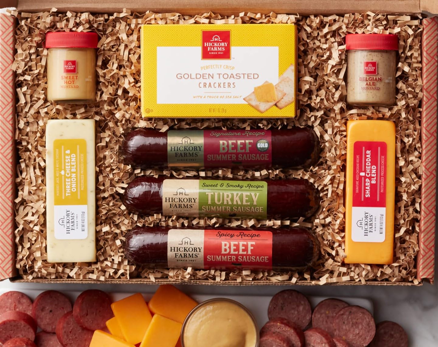 - Q: What items are included in the Hickory Farms Warm & Hearty Holiday Gift Box? A: The gift box includes a total of 8 items: 5 oz each of Signature Beef Summer Sausage, Spicy Beef Summer Sausage, and Sweet & Smoky Turkey Summer Sausage, along with 4 oz each of Farmhouse Cheddar, Smoked Cheddar Blend, and Three Cheese & Onion, plus additional condiments including a 2.25 oz Sweet Hot Mustard and a 2.5 oz Belgian Ale Mustard.