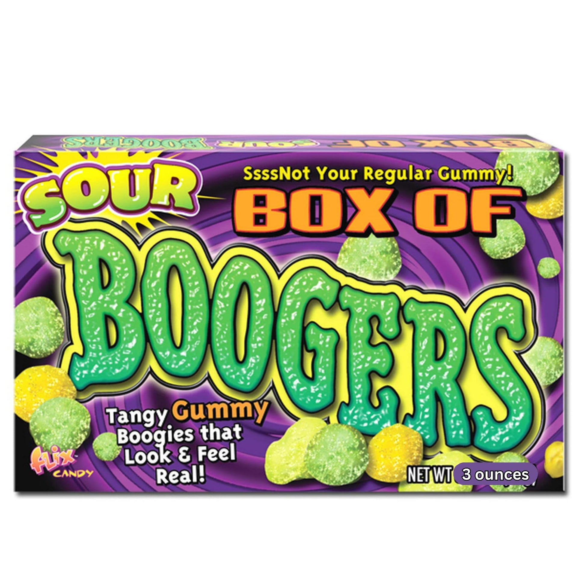 SOUR box of boogers shareable bundle comes with 3 movie theater size boxes PRANK your friends with these realistic sour gummy treats BOOGERS are Snottermelon, Sour Green Boogy and Slimeapple artificially flavored treats GROSS looking but YUMMY tangy sour gummy candies HILARIOUS gag gift for white elephant gift exchanges, party prizes and more