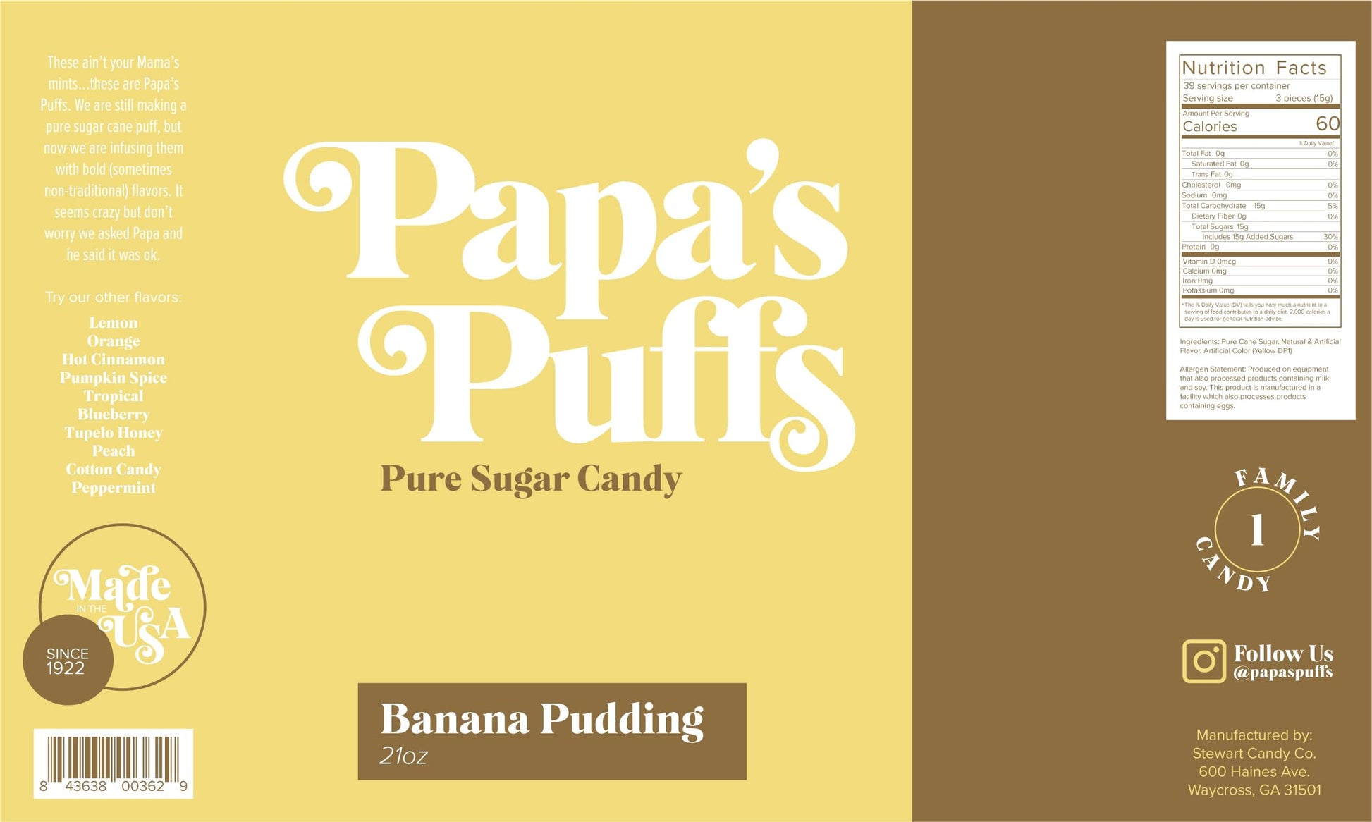 Q: What flavors do Papa's Puffs come in?A: Papa's Puffs are infused with bold and sometimes non-traditional flavors, including the popular banana pudding flavor. They are perfect for enjoying with cocktails, coffee, or as a fun snack.